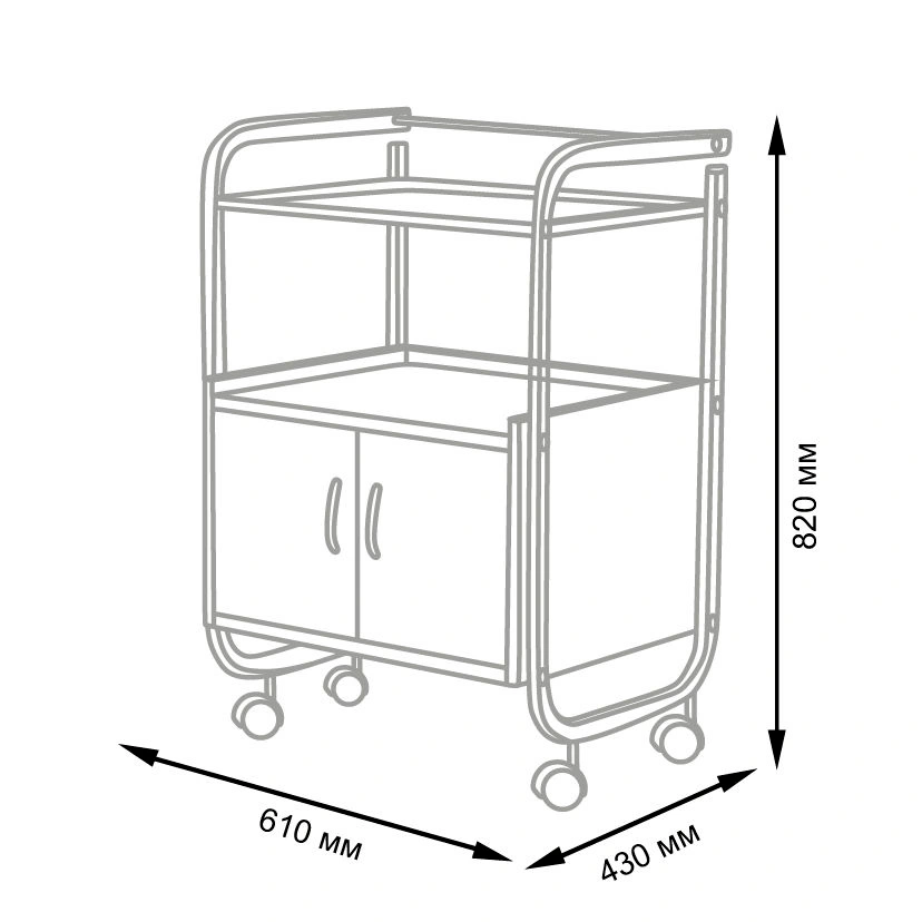 Комплектация: каркас, верхняя полочка, тумба, закрывающаяся дверками, вращающиеся колеса.