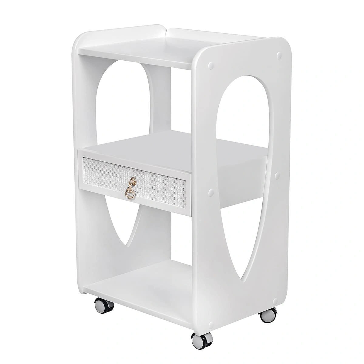 Конструкция столика не сложная, но продуманная и функциональная. Три открытые полки расположены на разных уровнях, где мастер может удобно расположить все необходимое оборудование при проведении косметологических или СПА-процедур. По центру находится небольшой выдвижной ящик с красивой декоративной накладкой и изящной ручкой. В ящике можно хранить расходные материалы и аксессуары, которые не хочется оставлять на виду. Благодаря тому, что высота ящика небольшая, расстояние между полками значительно увеличивается, и на них можно разместить высокие средства для СПА-процедур, или небольшую косметологическую технику. Самая верхняя полка оснащена бортиками с трех сторон, которые защищают от падения расположенные на ней инструменты.