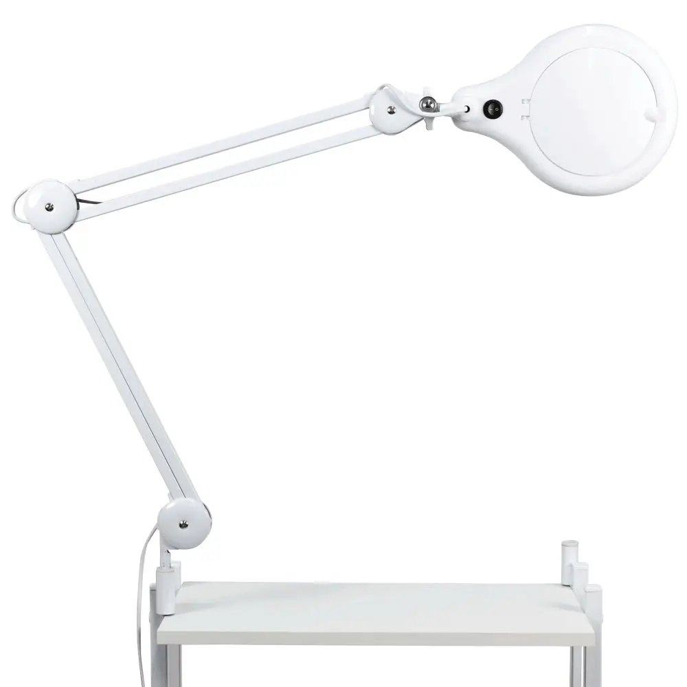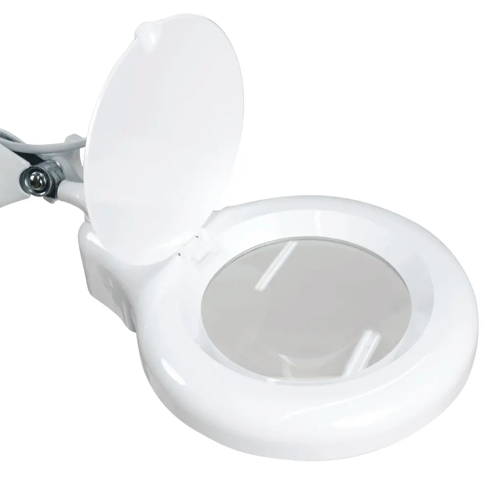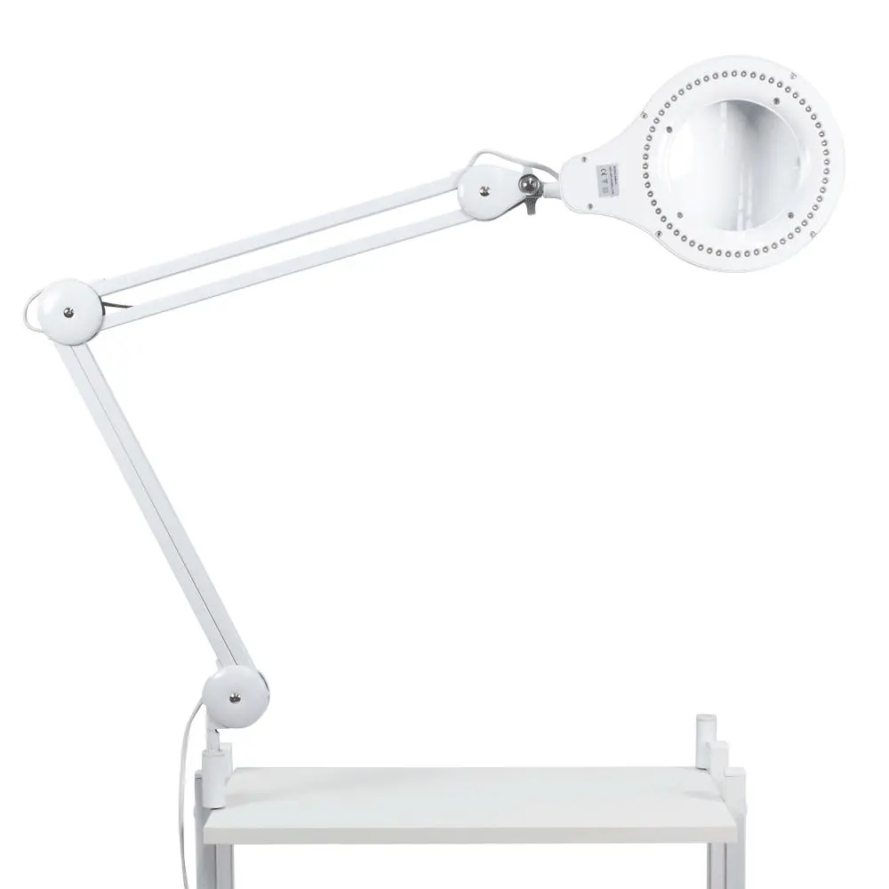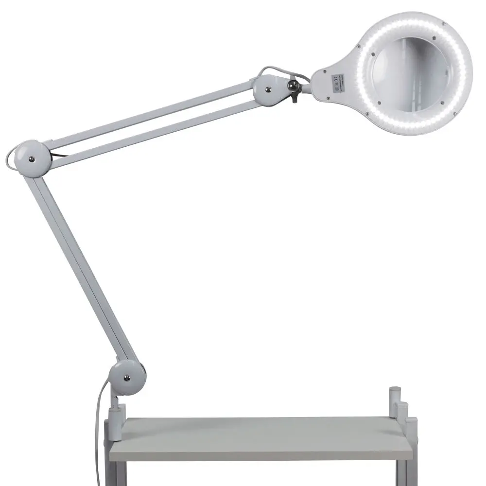 Лампа-лупа диодная на струбцине – отличное решение для профессионального использования. Она компактна, практична и обеспечивает хорошее освещение. Стеклянная лупа имеет размер 12,5 см, который считается наиболее удобным для работы. Металлический двухсекционный кронштейн позволяет менять наклон линзы в процессе процедур, не прерывая их. Для защиты линзы в данной модели предусмотрена специальная крышка. Технические характеристики стационарной диодной лампы-лупы: