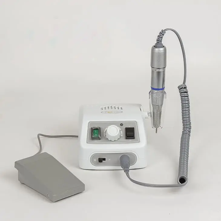 Аппарат для маникюра включает блок питания и ручку с цанговым зажимом. На корпусе блока питания располагается регулятор скорости, реверс, углубления для расстановки фрез, держатель для ручки. Ручка с микромотором имеет удобный цанговый зажим, в котором устанавливаются необходимые фрезы. Замена инструмента занимает считанные секунды. С помощью удобной педали можно включить и выключить аппарат, когда руки мастера заняты. Для удобной транспортировки предусмотрена компактная сумка.