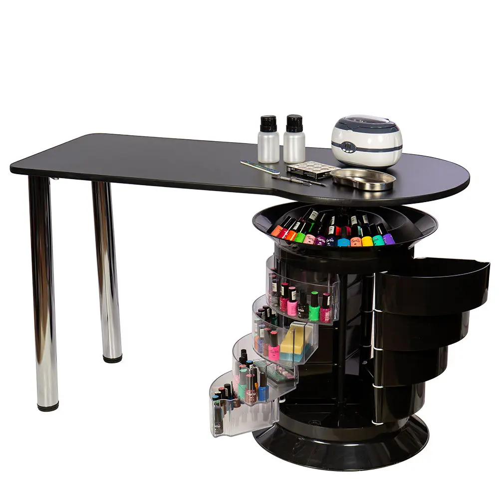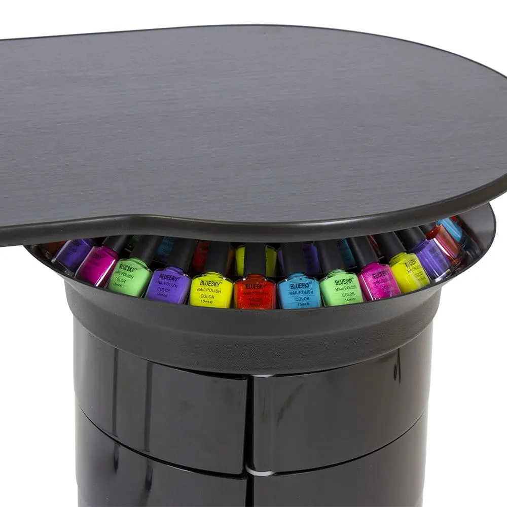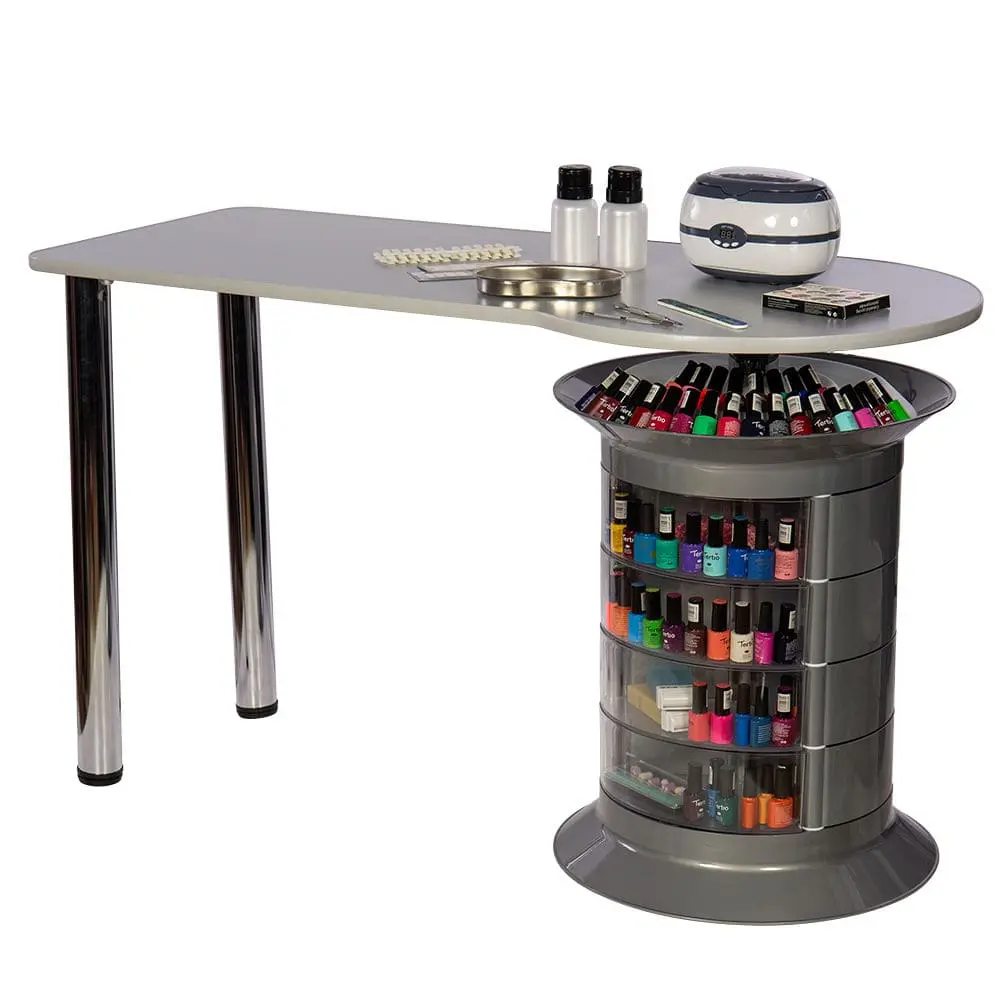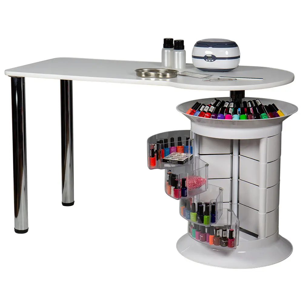 Инструменты, расходные материалы и аксессуары можно хранить в удобных выдвижных ящичках. Мастер сможет с легкостью находить необходимые приспособления, ведь тумбу можно вращать вокруг своей оси. Для лаков над тумбой предусмотрена удобная полочка. С широкой столешницей есть возможность поставить необходимое сопутствующее оборудование, не загромождая рабочую поверхность.