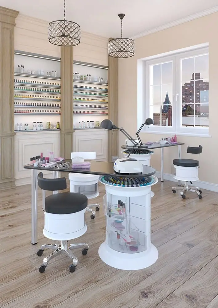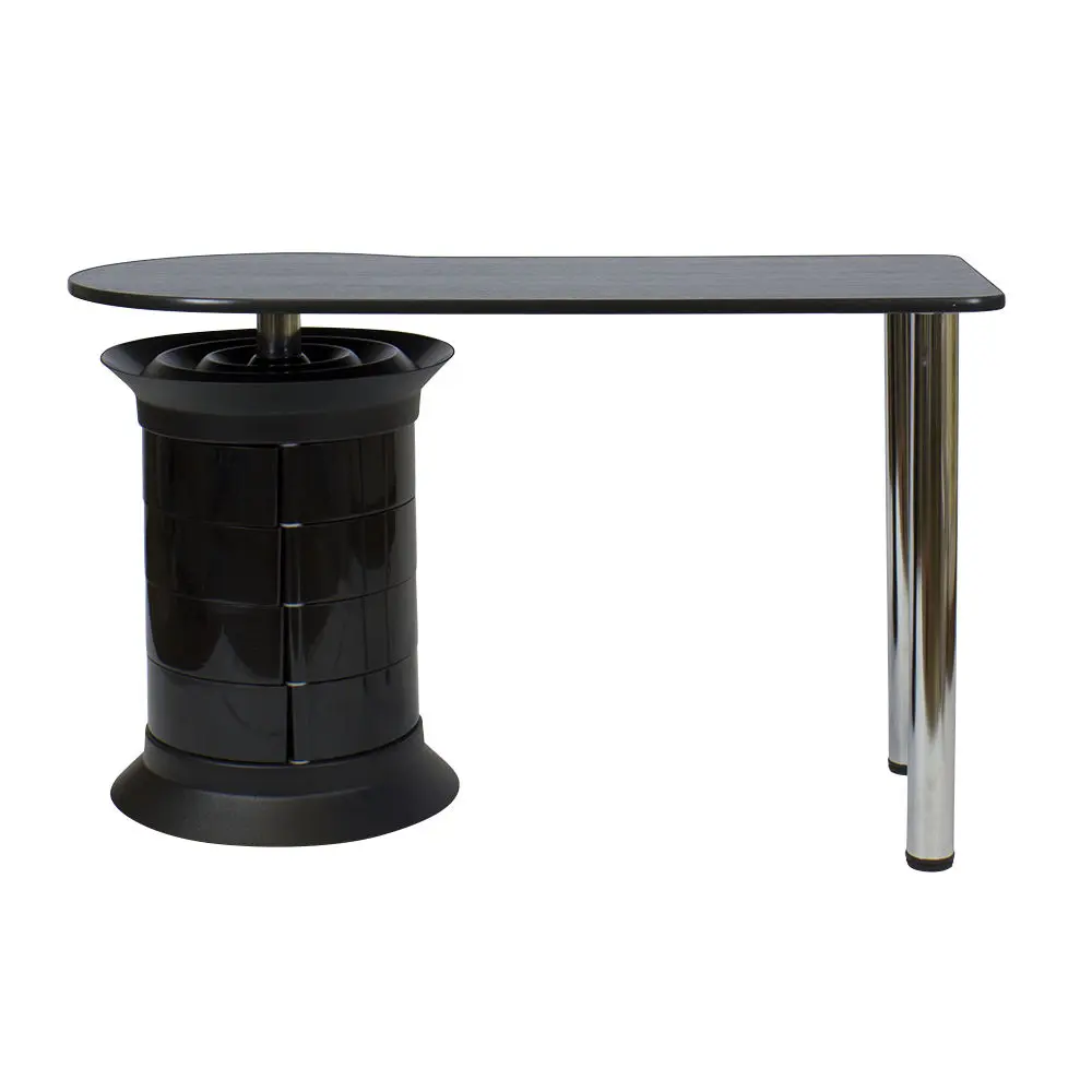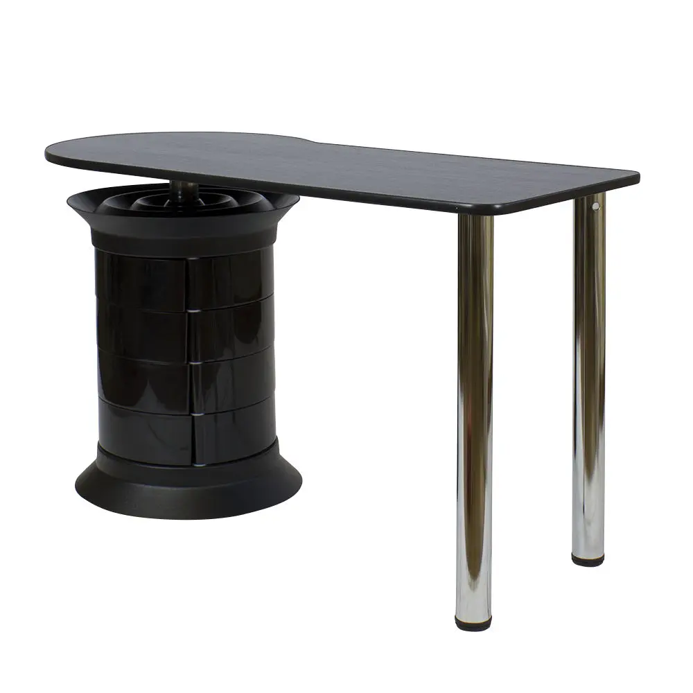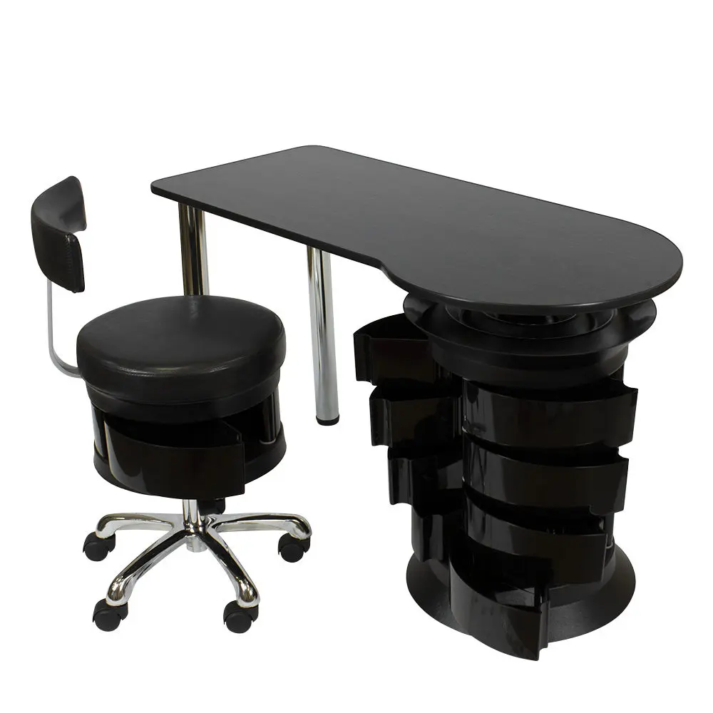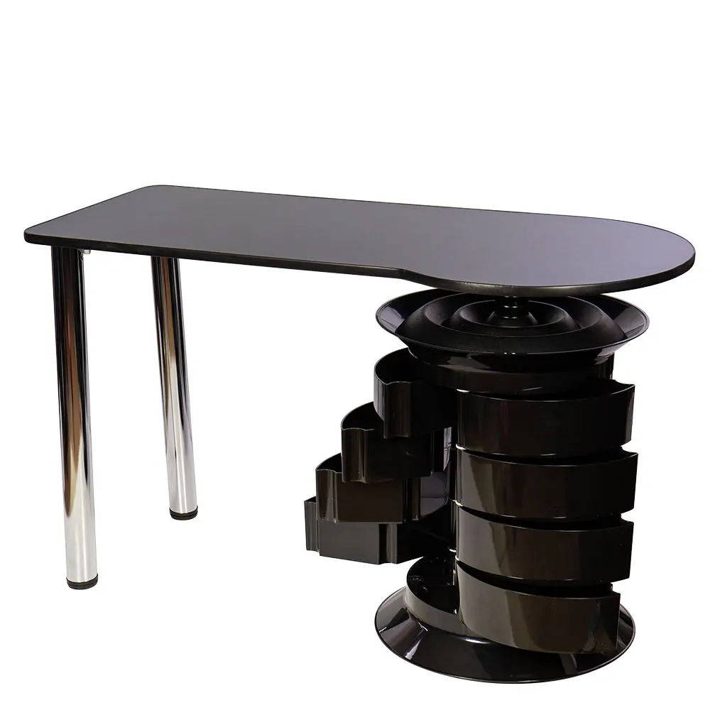 Инструменты, расходные материалы и аксессуары можно хранить в удобных выдвижных ящичках. Мастер сможет с легкостью находить необходимые приспособления, ведь тумбу можно вращать вокруг своей оси. Для лаков над тумбой предусмотрена удобная полочка. С широкой столешницей есть возможность поставить необходимое сопутствующее оборудование, не загромождая рабочую поверхность.