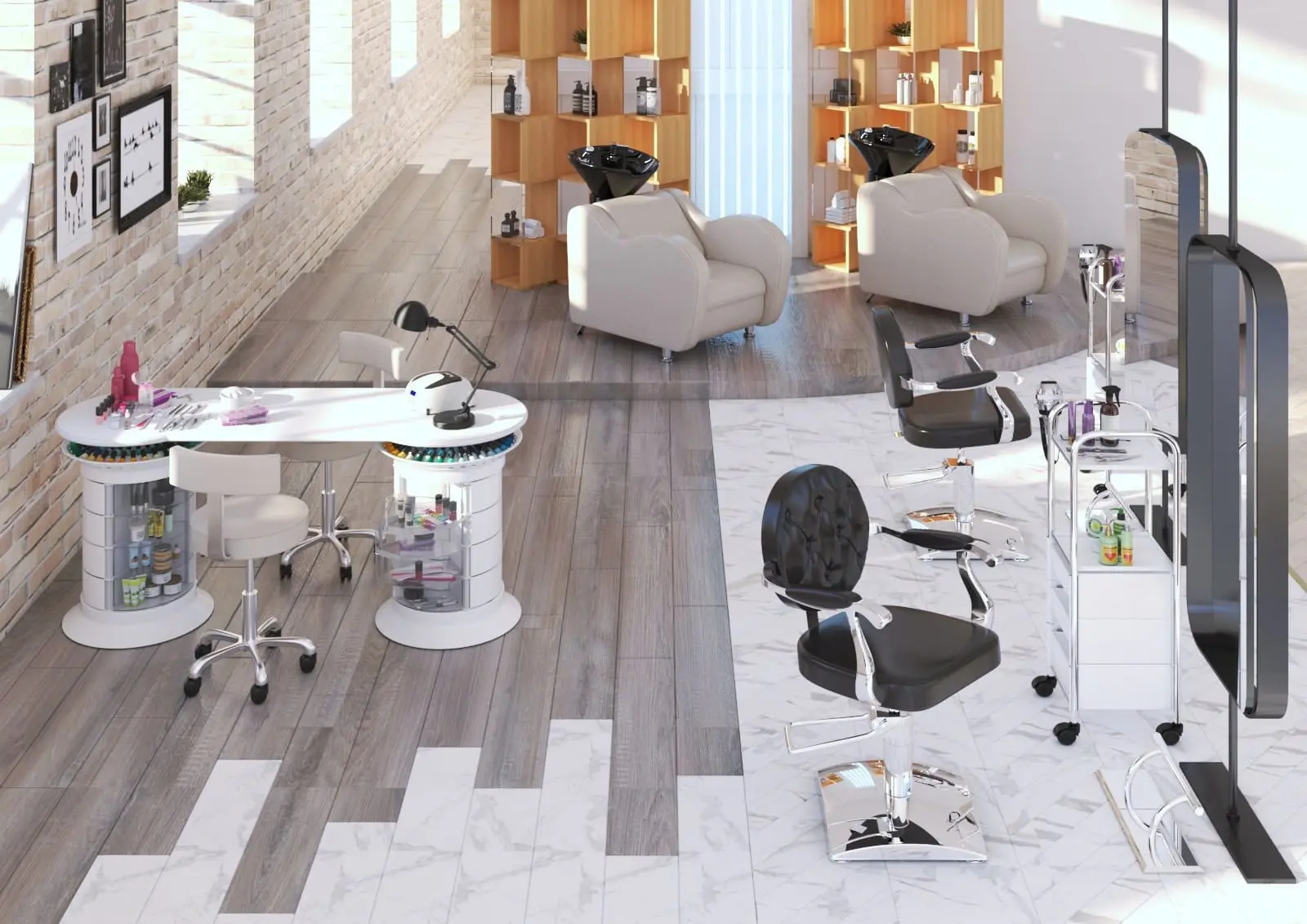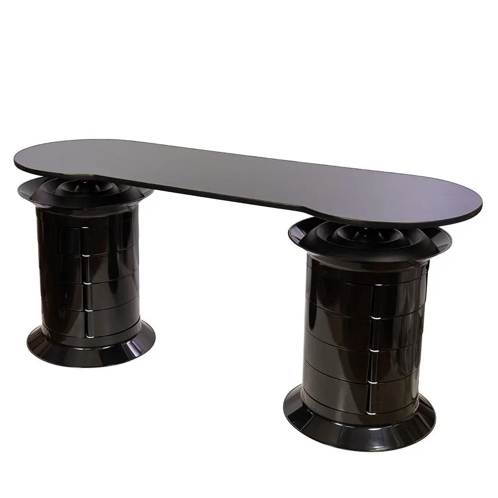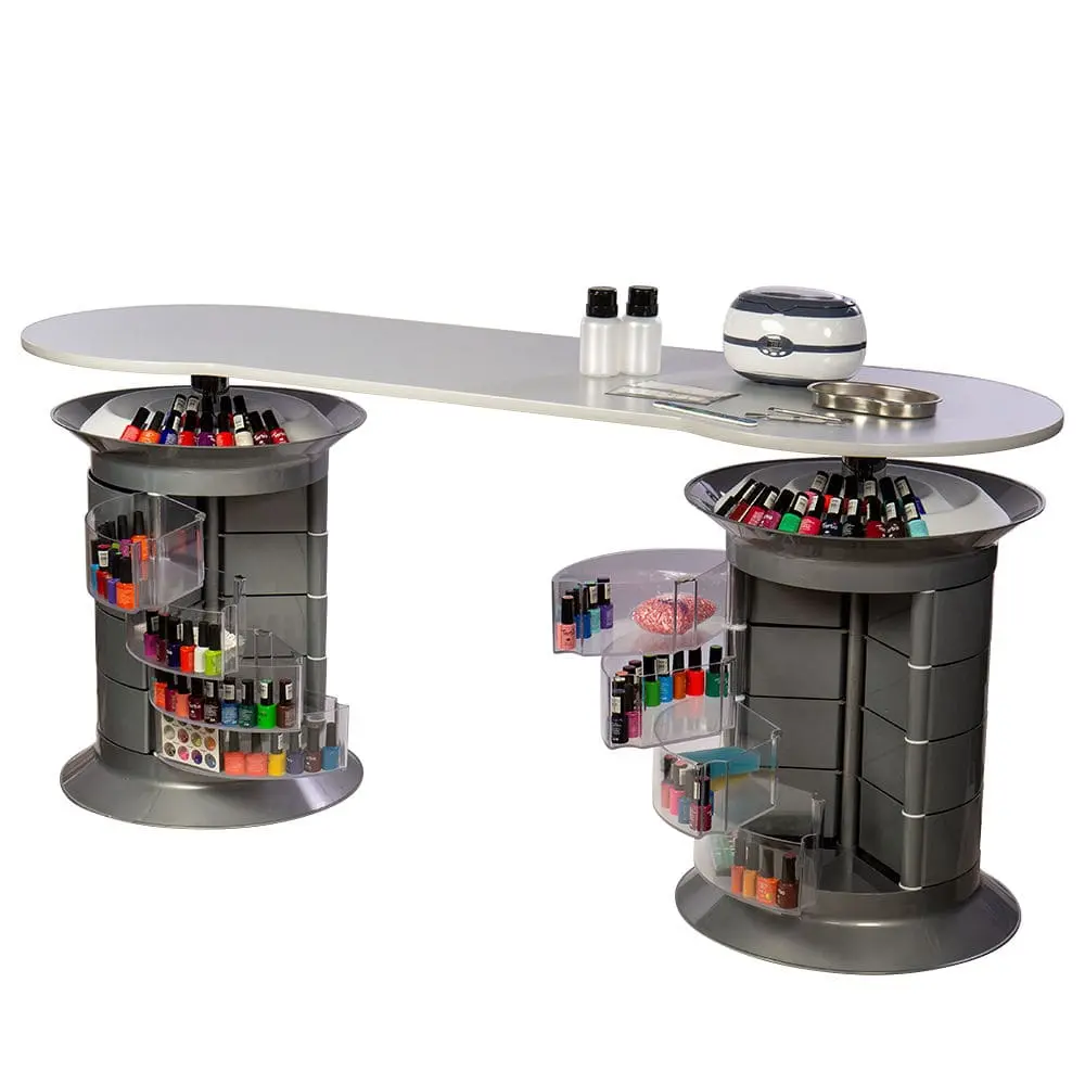 В распоряжении мастера 24 ящичка, в которых поместятся все инструменты и расходные материалы. Удобная раздвижная система позволит быстро найти и взять необходимые принадлежности. Над тумбой предусмотрена практичная крышка, разработанная специально для хранения лаков. Чтобы облегчить поиск нужных приспособлений, каждая тумба вращается вокруг своей оси. На столешнице достаточно места, чтобы поставить сопутствующее оборудование и разложить необходимые инструменты.