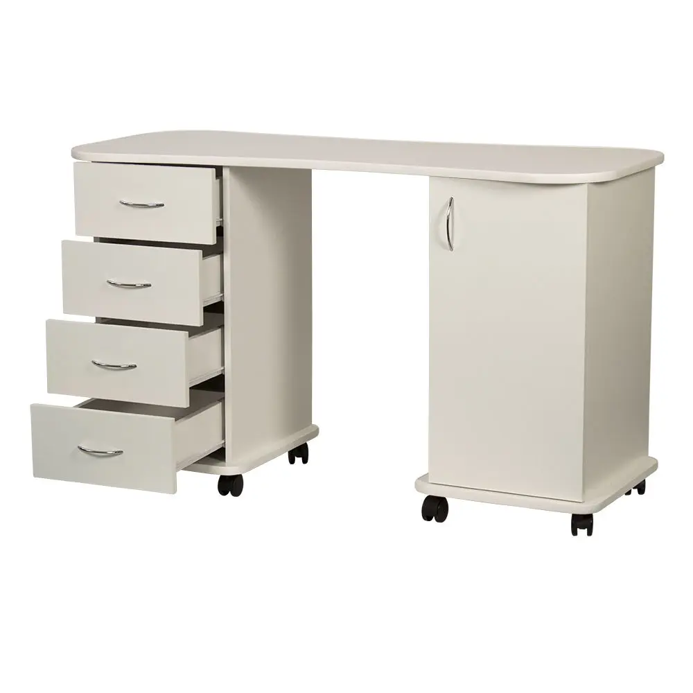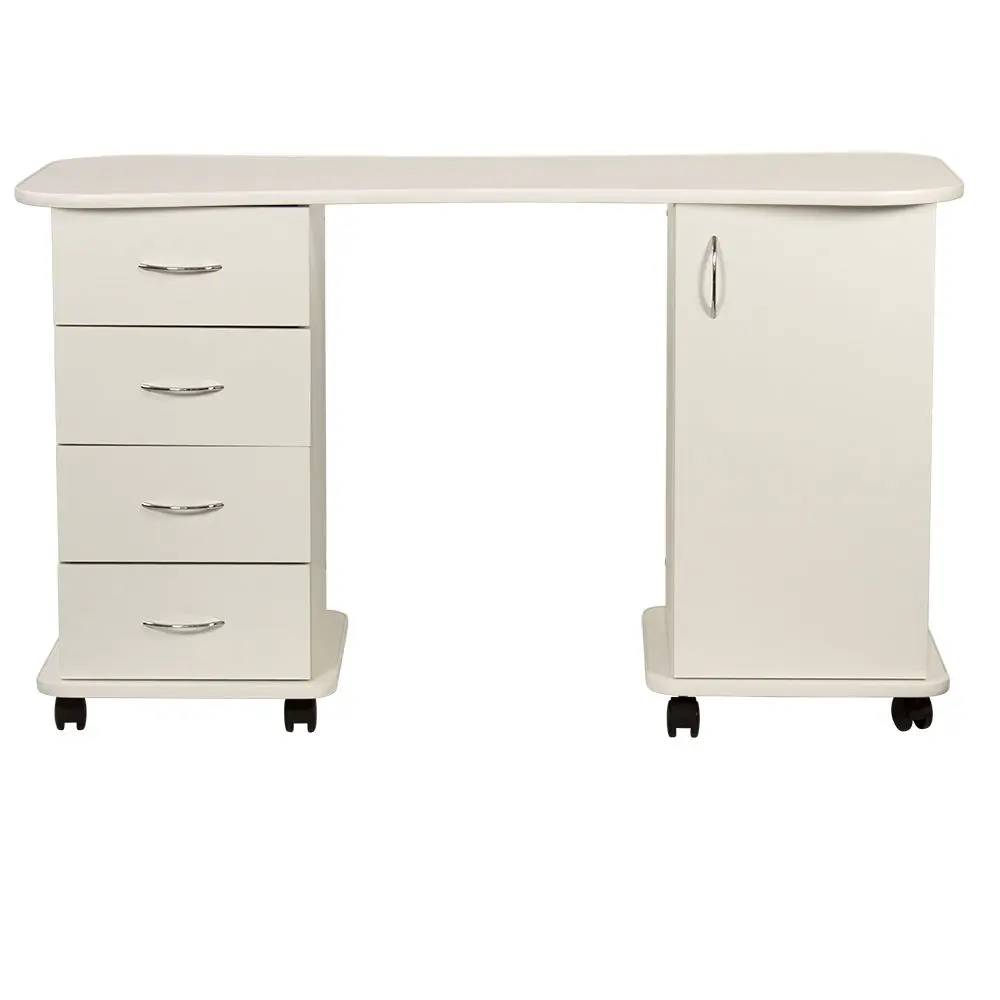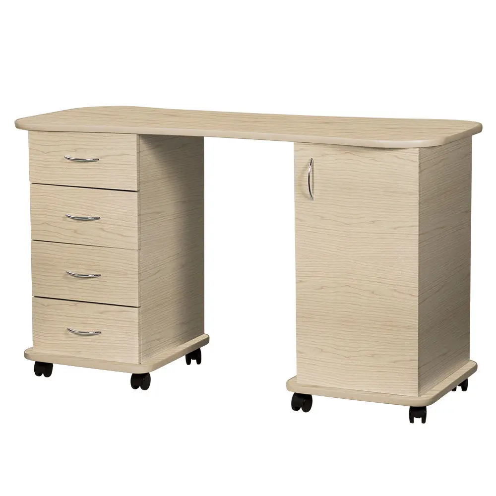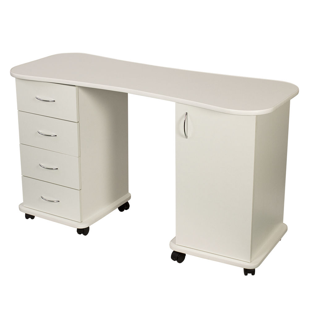 Профессиональный стол маникюрный Эсти-2 выполнен в классическом стиле с применением качественных прочных материалов. Он оснащен удобной широкой столешницей, форма которой обеспечит комфорт мастеру и клиенту в процессе выполнения маникюра. Для размещения рабочих принадлежностей (инструменты, приборы, расходные материалы) в данной модели предусмотрены вместительные тумбы. Одна из них имеет полки и закрывается на дверку, а другая комплектуется четырьмя ящиками. Аксессуары и прочие принадлежности, которые должны находиться всегда под рукой, мастер сможет разместить непосредственно на столешнице.