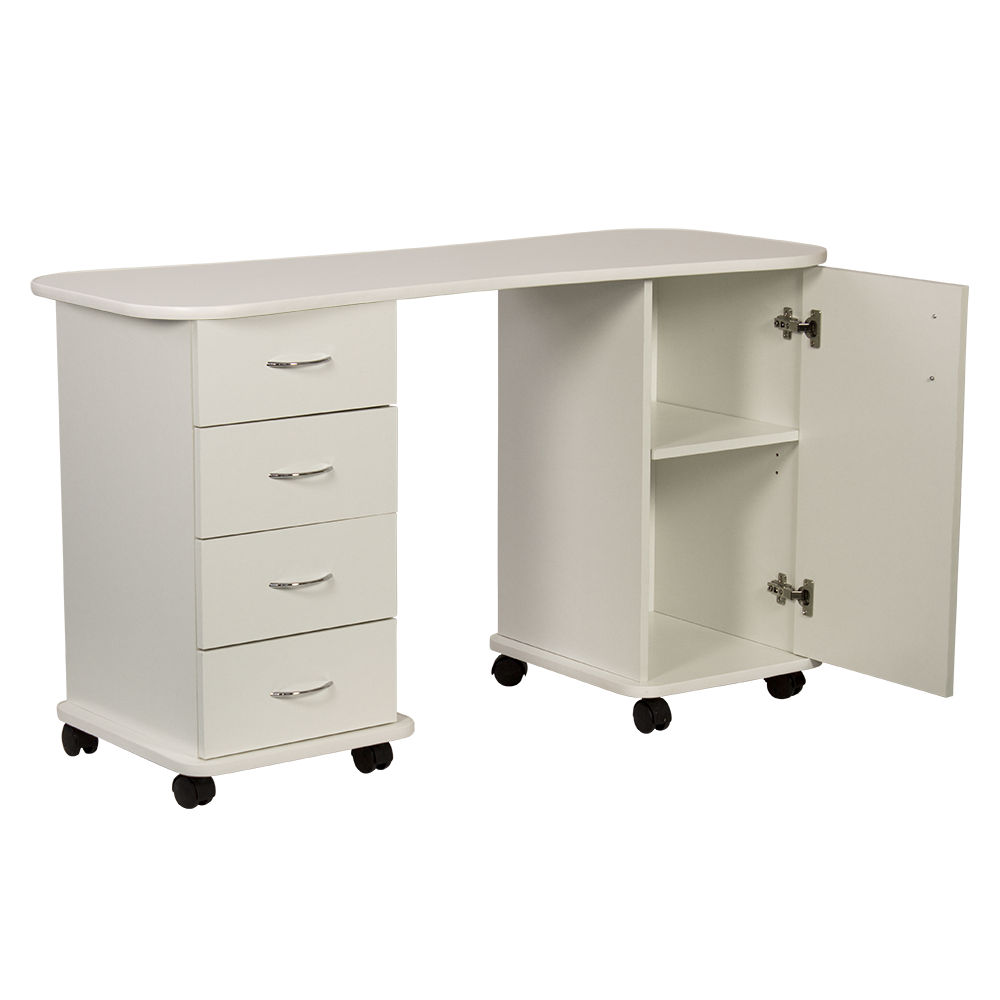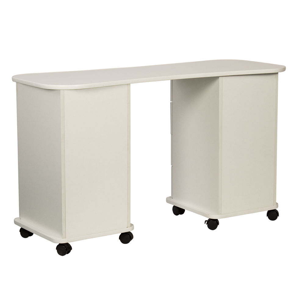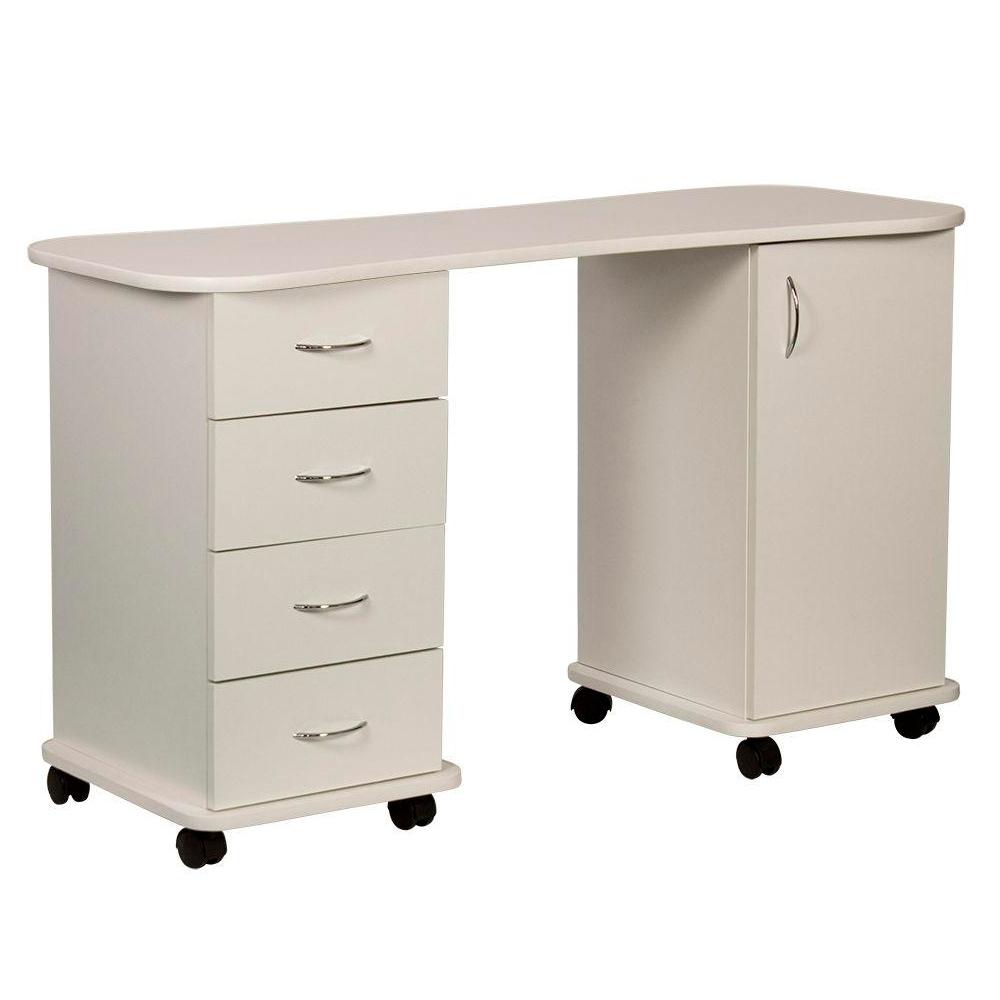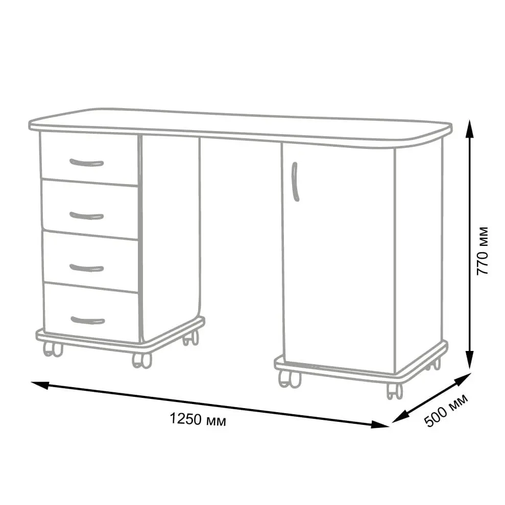 Если Вы желаете купить стильный и удобный стол для маникюра – Эсти-2 сможет полностью удовлетворить Ваши потребности. Он выполнен из качественной ламинированной ДСП, которая отличается высокой прочностью и долговечностью. Ламинированное покрытие легко очищается, не боится воздействия влаги и дезинфицирующих средств, а также длительное время сохраняет красивый внешний вид. Тумбы установлены на колеса, благодаря которым стол можно легко перемещать и поворачивать. В нашем магазине маникюрный стол Эсти-2 можно купить из наличия в цветах складкой программы (венге, венге/белый дуб), или под заказ, в любом другом цвете из каталога.