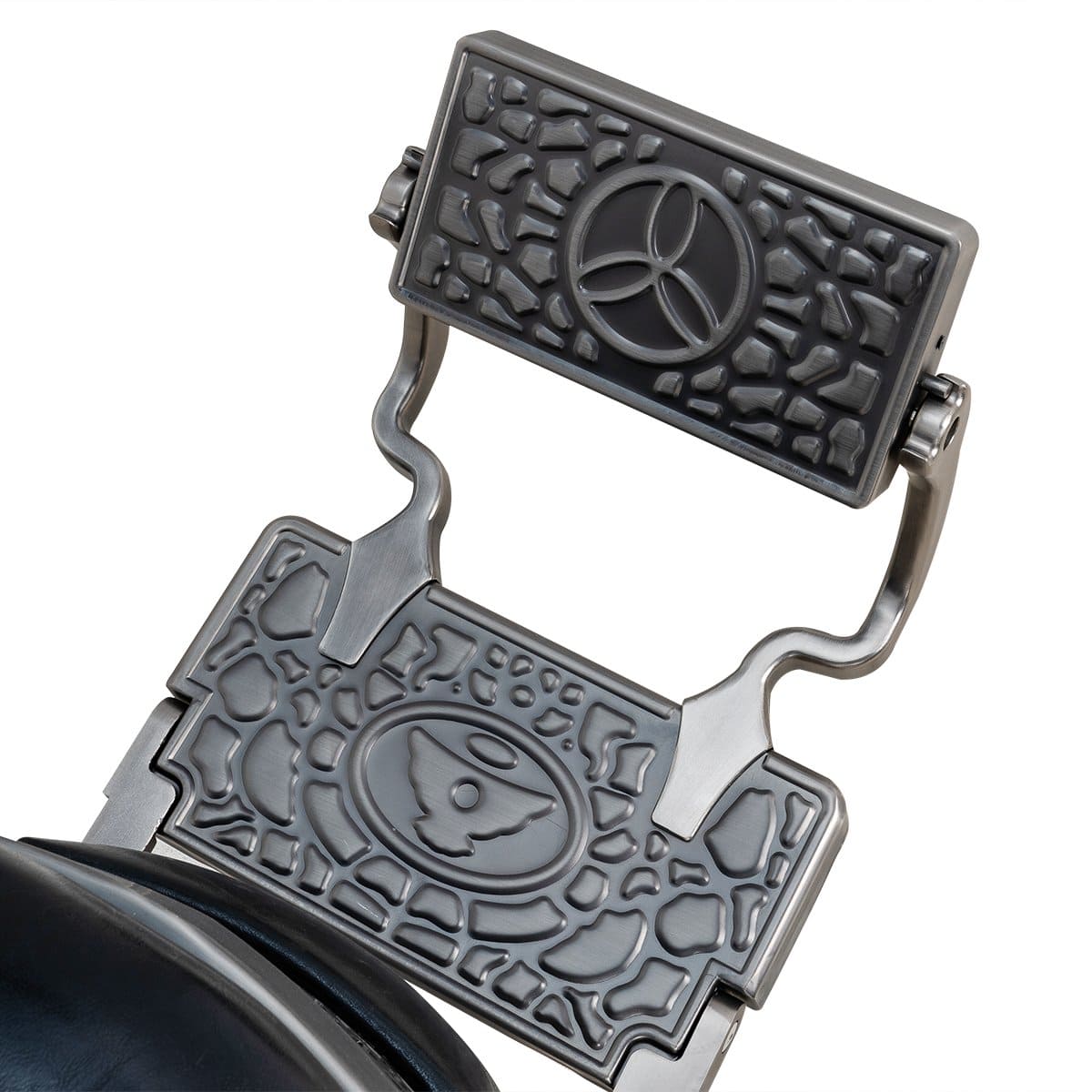 В дизайне кресла присутствует много металлических деталей и фурнитуры под медь или шагрень. Подлокотники и подставка на подножках обиты экокожей, что придает креслу большей солидности, а клиенту максимального комфорта.