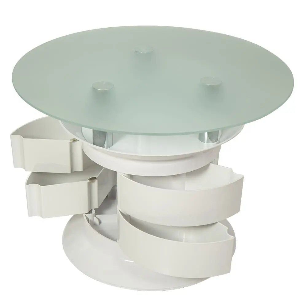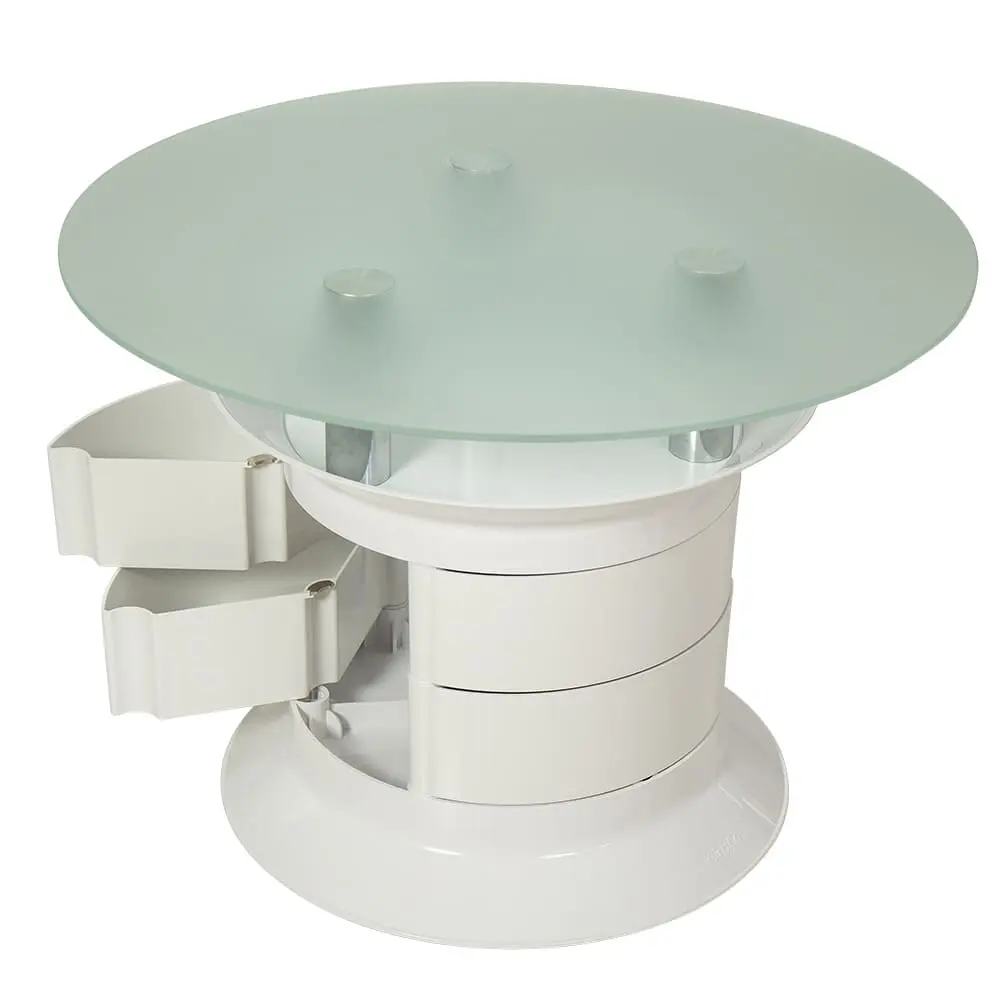 Мебель дополнена вместительными ящичками. Неоспоримый плюс столика – мобильность, обеспеченная надежными вращающимися колесами.