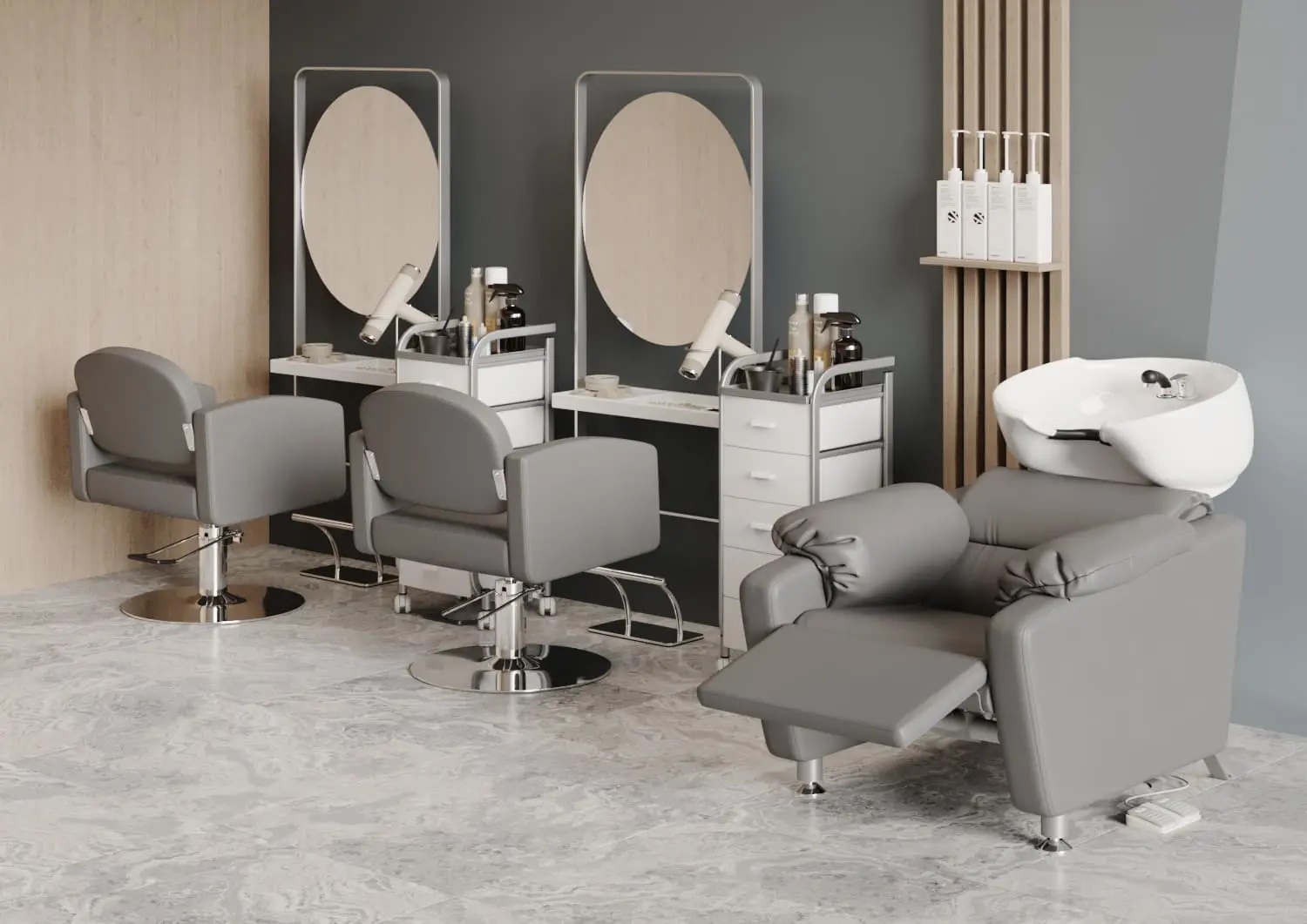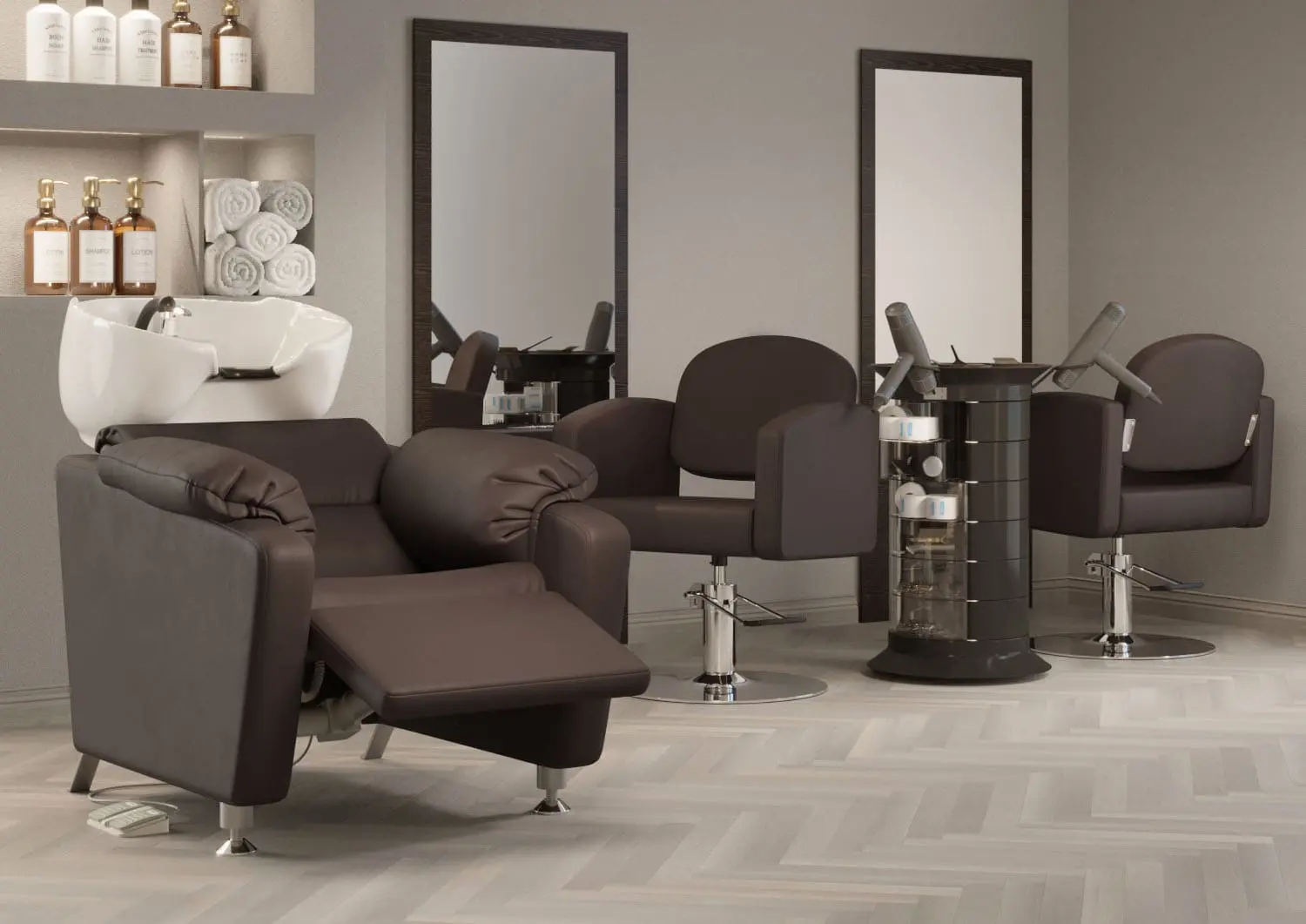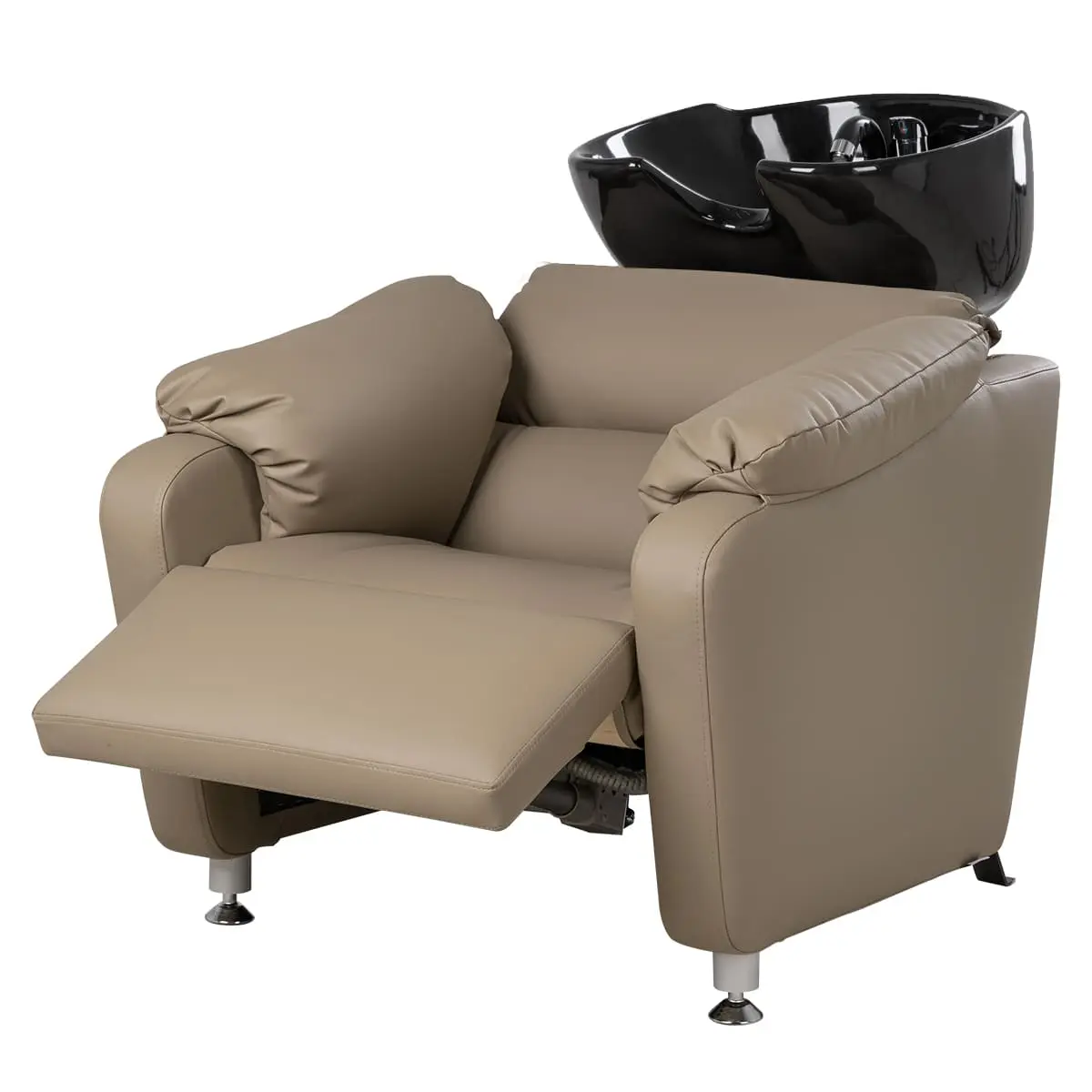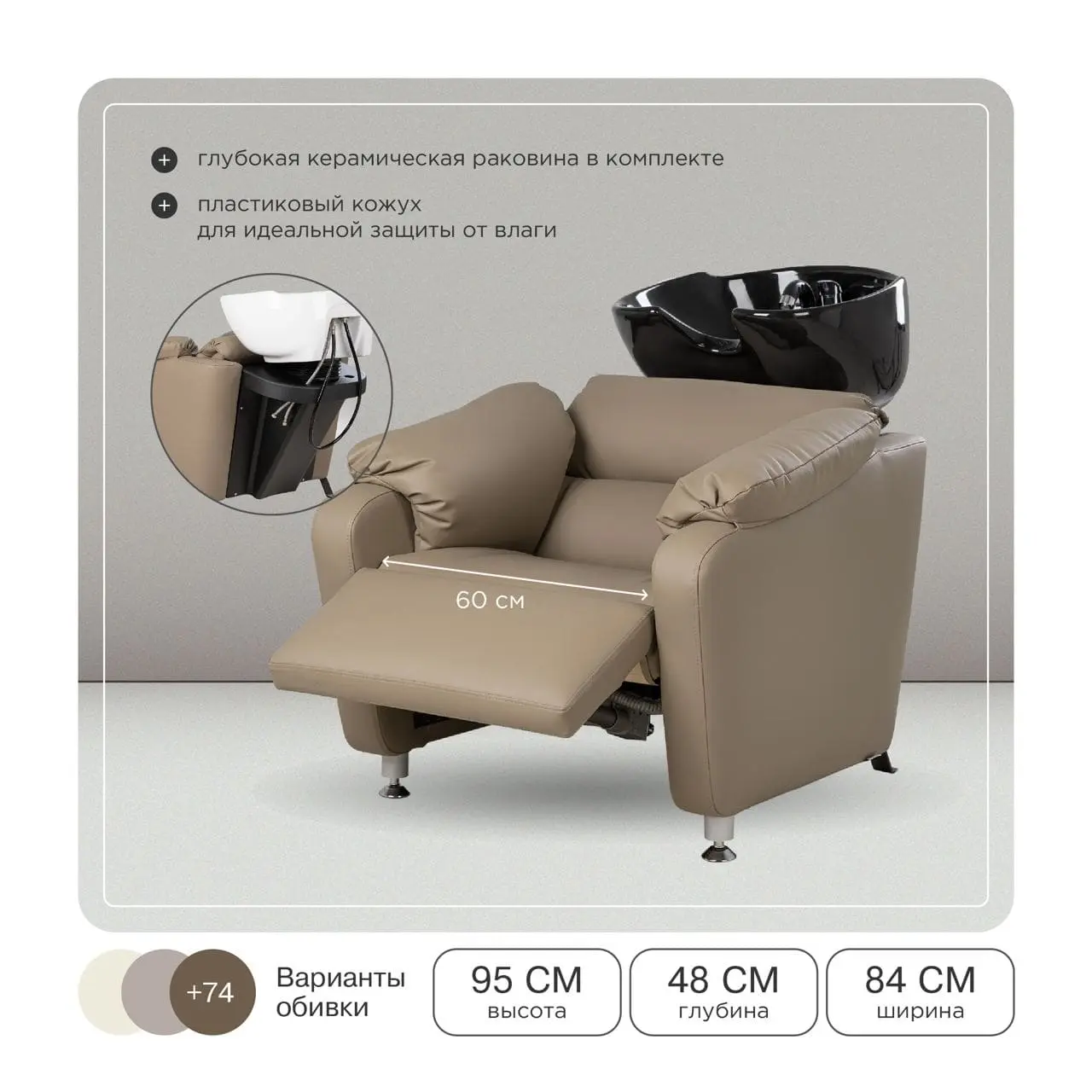 Кресло регулируется с помощью электромотора (можно подстроить под удобное положение клиента), раскладывается в полулежачее состояние, оснащено гидравлическим подъёмником для регулировки высоты и надежными креплениями, которые увеличат срок службы оборудования. У мойки-реклайнера увеличенная широкая посадка (60 см) — подойдёт для клиентов любого телосложения, широкое сиденье с массивными мягкими подлокотниками, металлическое основание на противоскользящих подпятниках. Для ног предусмотрена практичная откидная подставка (регулируется с помощью пульта). Благодаря повышенному комфорту - любые, даже самые продолжительные процедуры станут для клиента настоящим отдыхом, что без сомнений придаст салону уникальность и эксклюзивность.