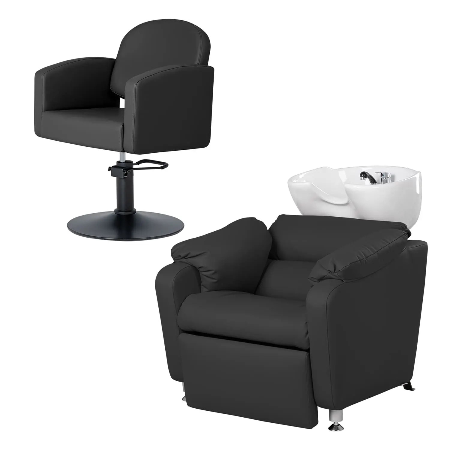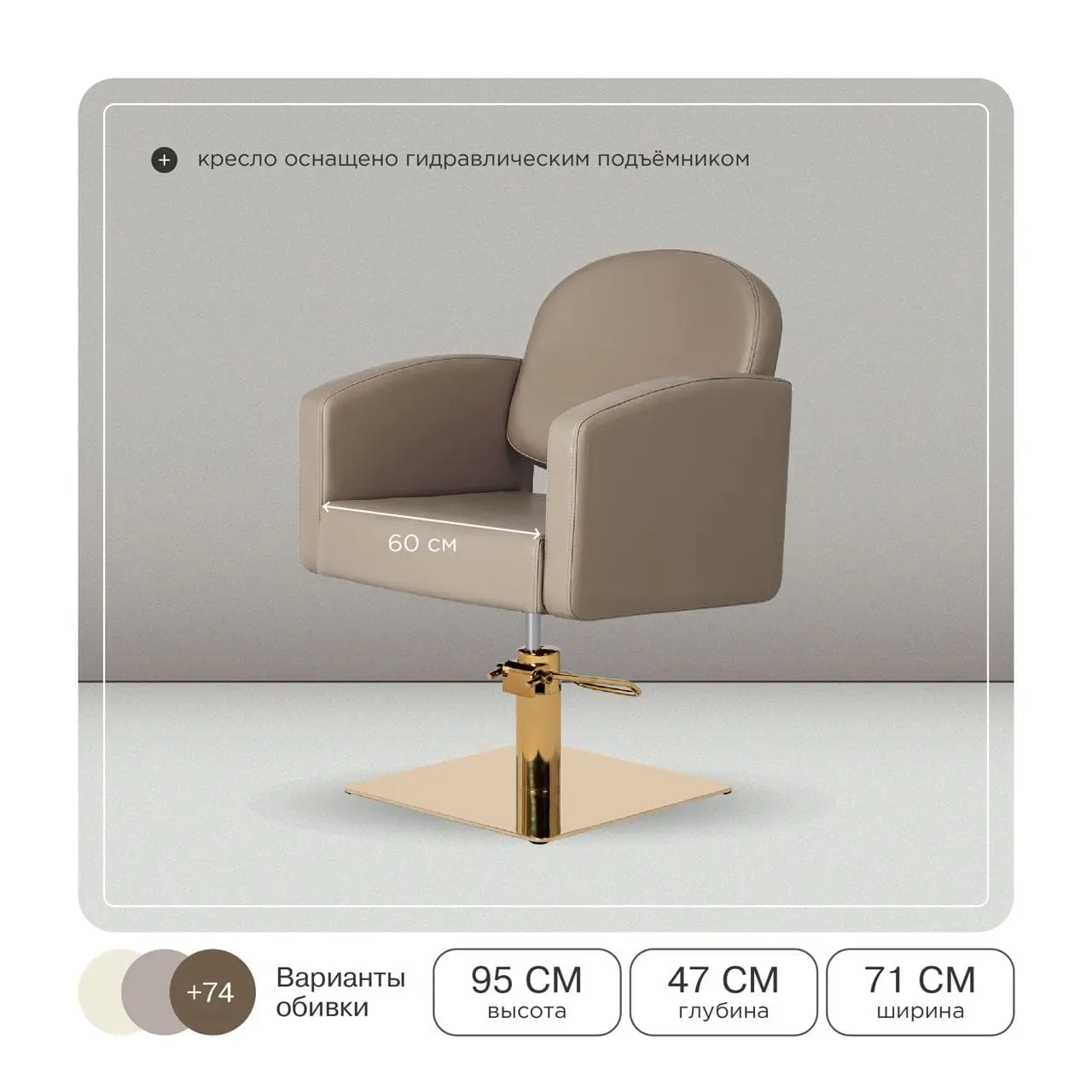 Удобное сидение с мягкой спинкой в сочетании с подлокотниками помогут обеспечить комфорт каждому клиенту. В качестве наполнителя применён плотный поролон, который не образует вмятин в течение длительного срока эксплуатации. Для обшивки использована прочная экокожа, устойчивая к разрывам, растягиванию и протиранию. Уход за поверхностью необычайно прост, потому что материал не впитывает влагу и грязь. Пыль с такой мебели можно удалить сухой текстильной салфеткой, а пятна от косметических продуктов стираются специальными моющими составами для кожи без хлора.