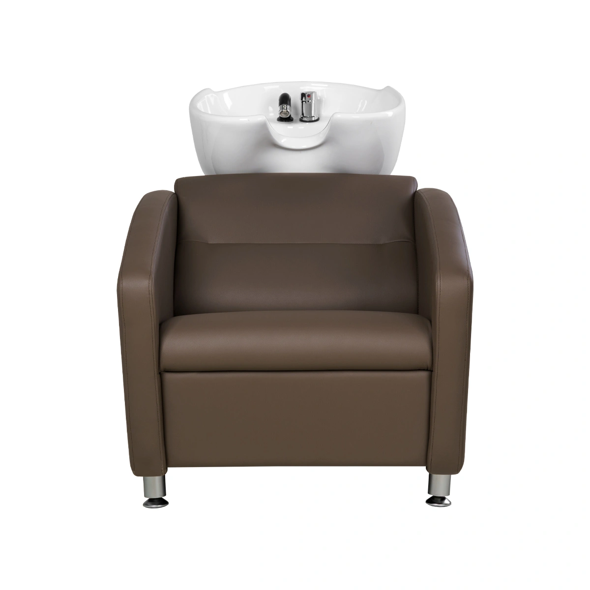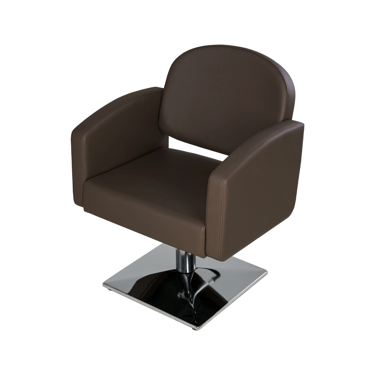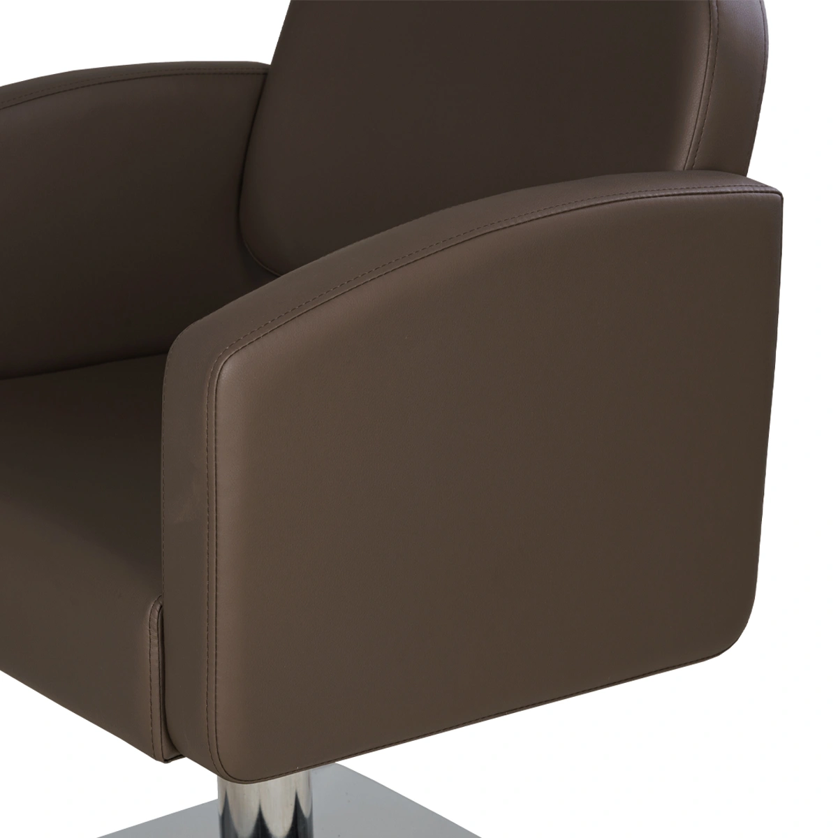 Удобное сидение с мягкой спинкой в сочетании с подлокотниками помогут обеспечить комфорт каждому клиенту. В качестве наполнителя применён плотный поролон, который не образует вмятин в течение длительного срока эксплуатации. Для обшивки использована прочная экокожа, устойчивая к разрывам, растягиванию и протиранию. Уход за поверхностью необычайно прост, потому что материал не впитывает влагу и грязь. Пыль с такой мебели можно удалить сухой текстильной салфеткой, а пятна от косметических продуктов стираются специальными моющими составами для кожи без хлора.