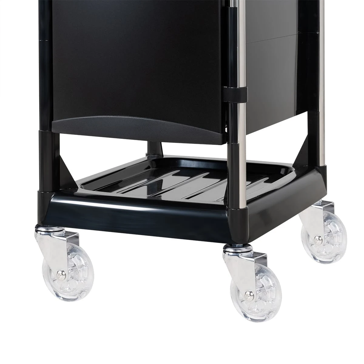 Основание парикмахерской тележки Т-130 на на 4 бесшумных силиконовых колесиках, благодаря чему мастер сможет легко перемещать ее в рабочей зоне, не прерывая рабочий процесс.