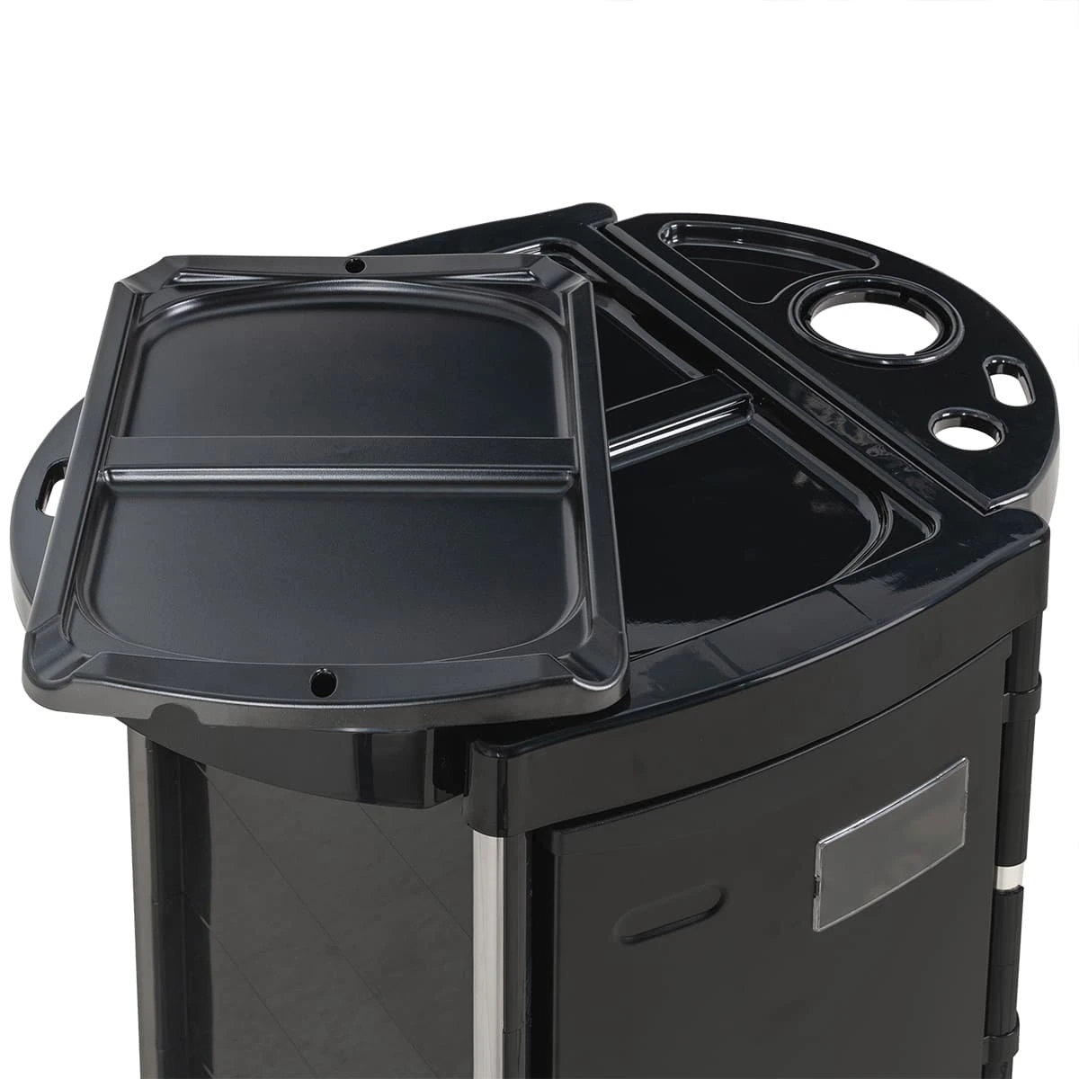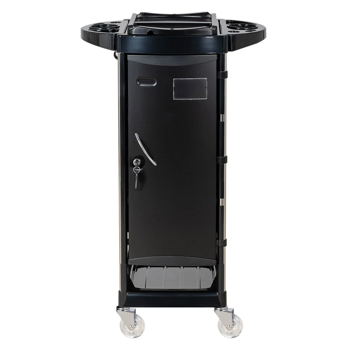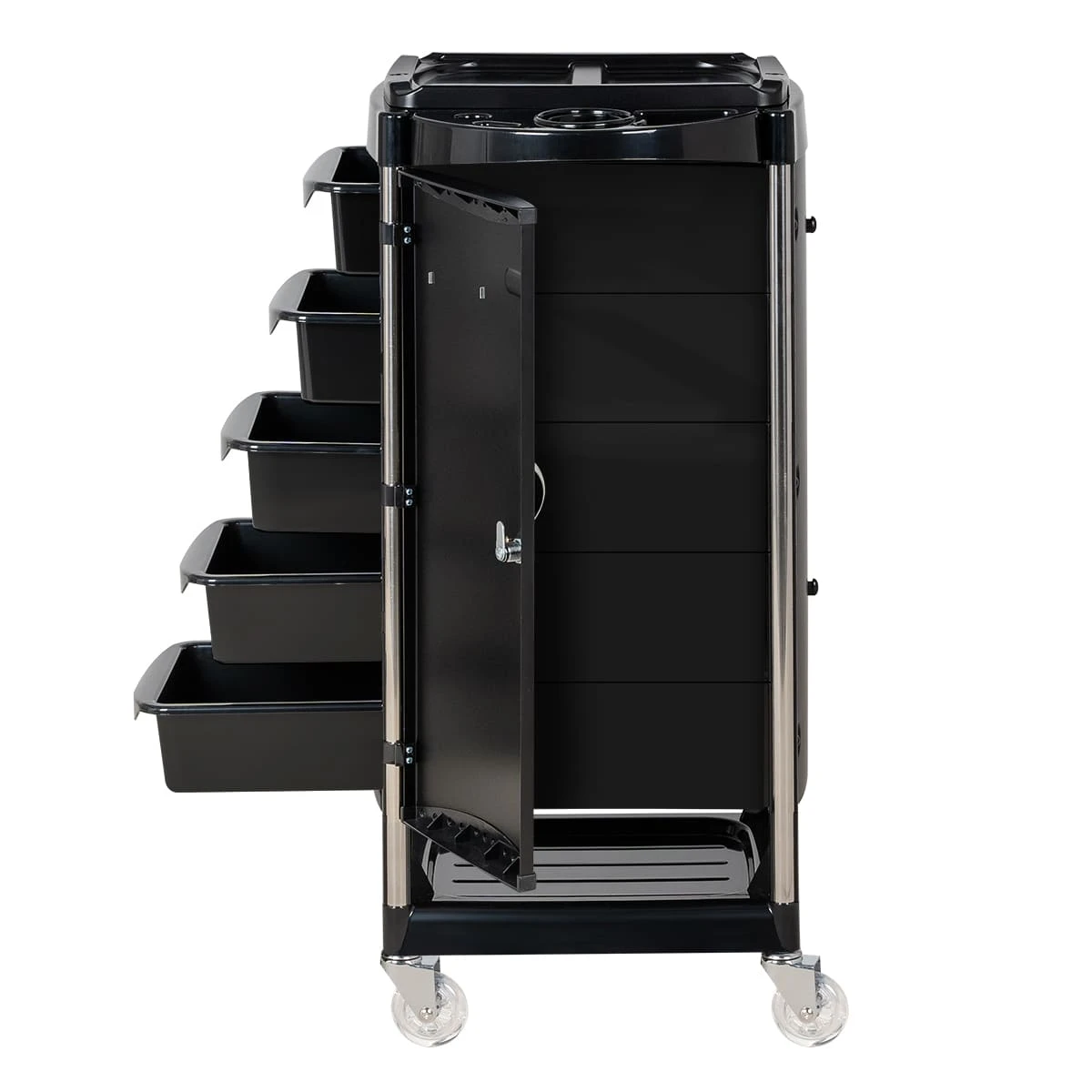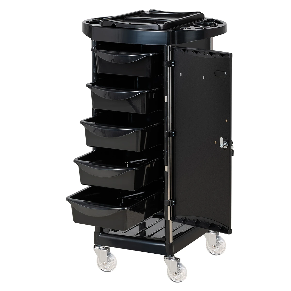 Верхняя крышка тележки с отверстиями для брашингов, фена и ёмкостей, двумя складными боковыми подставками и съёмной разделительной крышкой. Имеется 5 выдвижных вместительных ящиков и нижняя открытая полочка. Закрытые боковины и дверца с замком, обеспечивающие надёжность, защиту от влаги, пыли, волос и красящих элементов!
