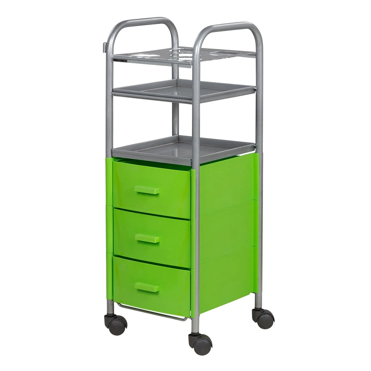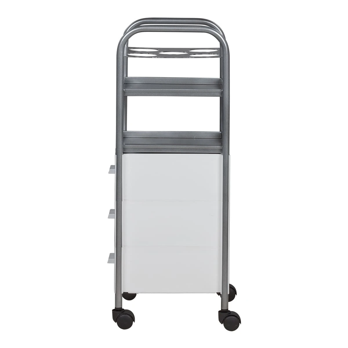 Каркас парикмахерской тележки выполнен из оцинкованной стали. Пластиковые колеса обеспечивают тихое перемещение оборудования и не царапают напольное покрытие. Полки выполнены из металла, устойчивого к воздействию дезинфицирующих и косметических средств. Ящики и боковые стенки изготовлены из ударопрочного пластика.