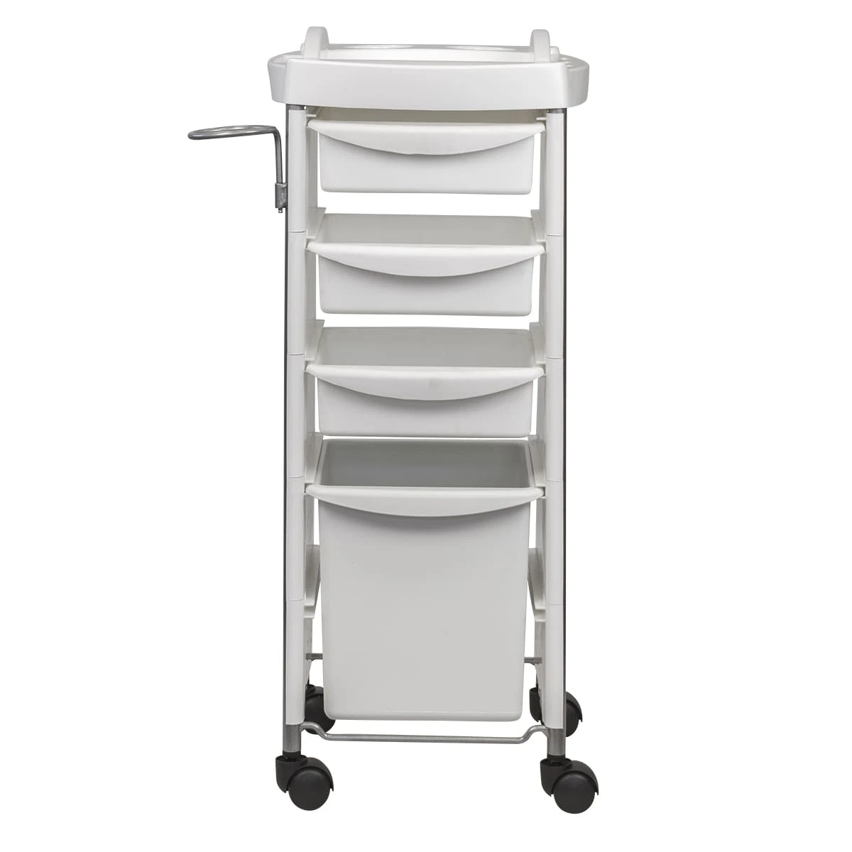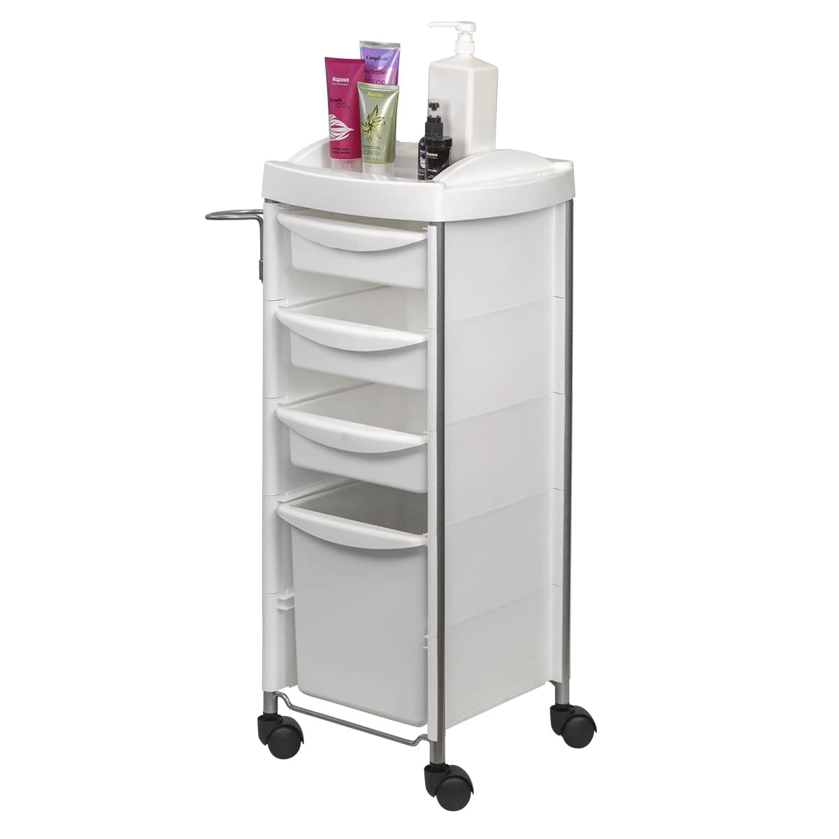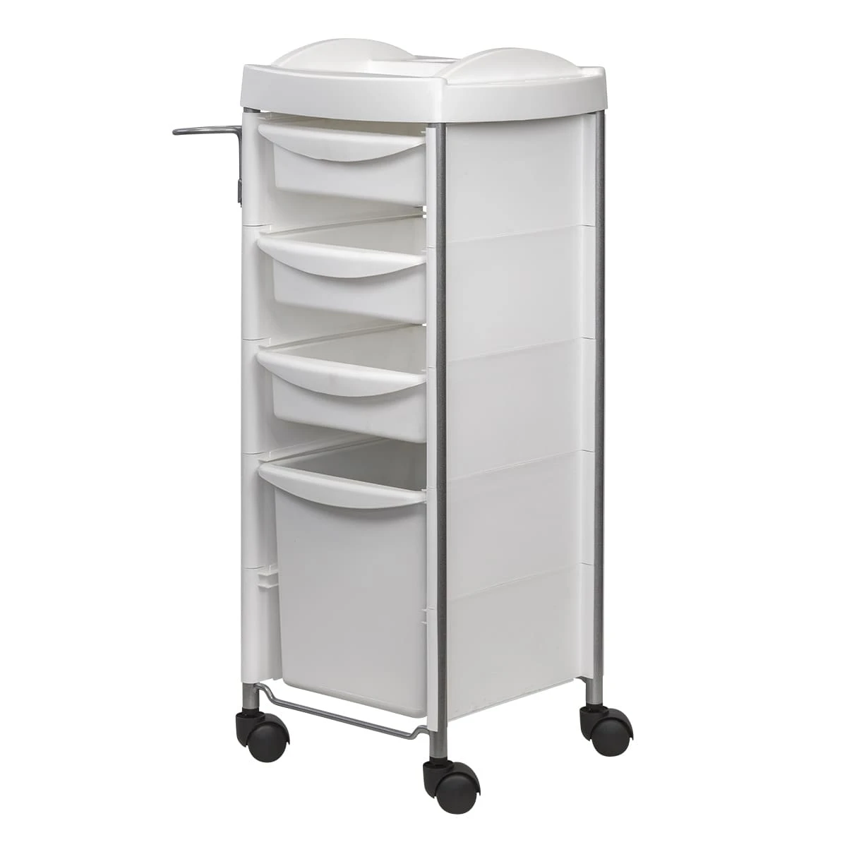 Каркас парикмахерского оборудования выполнен из металлических труб. Ящики, полка и боковины изготовлены из прочного пластика. Материал не деформируется при случайном попадании косметических средств, хорошо переносит регулярную чистку и дезинфекцию. Колеса из качественного пластика не оставляют царапин на полу и обеспечивают бесшумное перемещение оборудования.