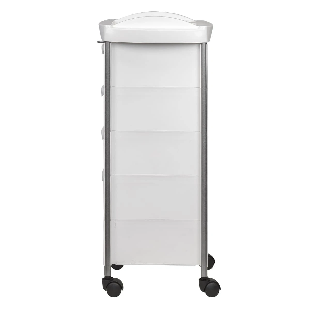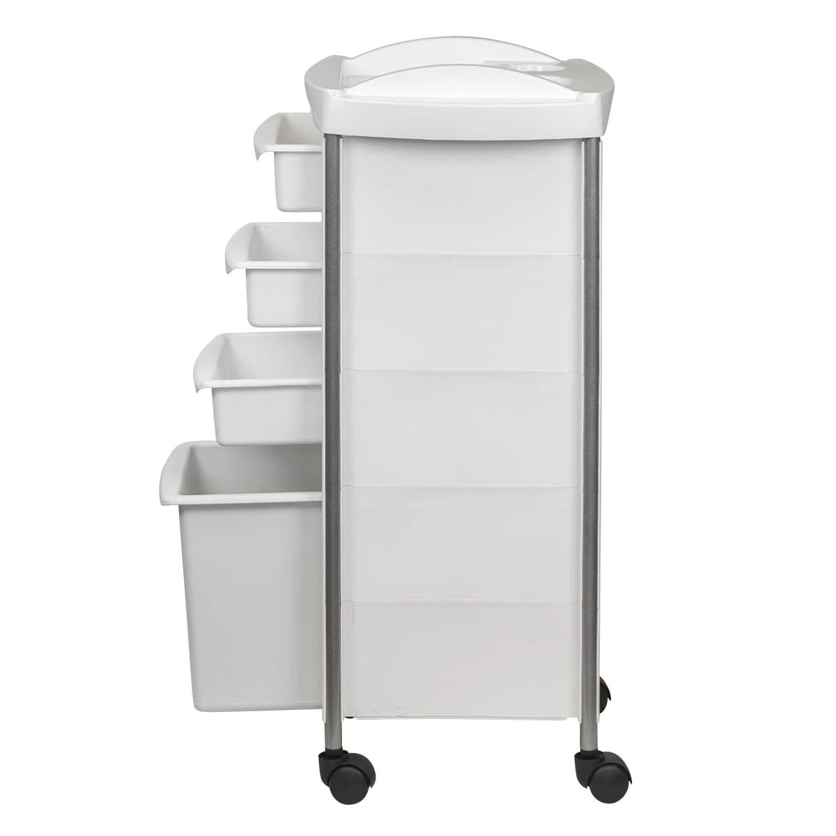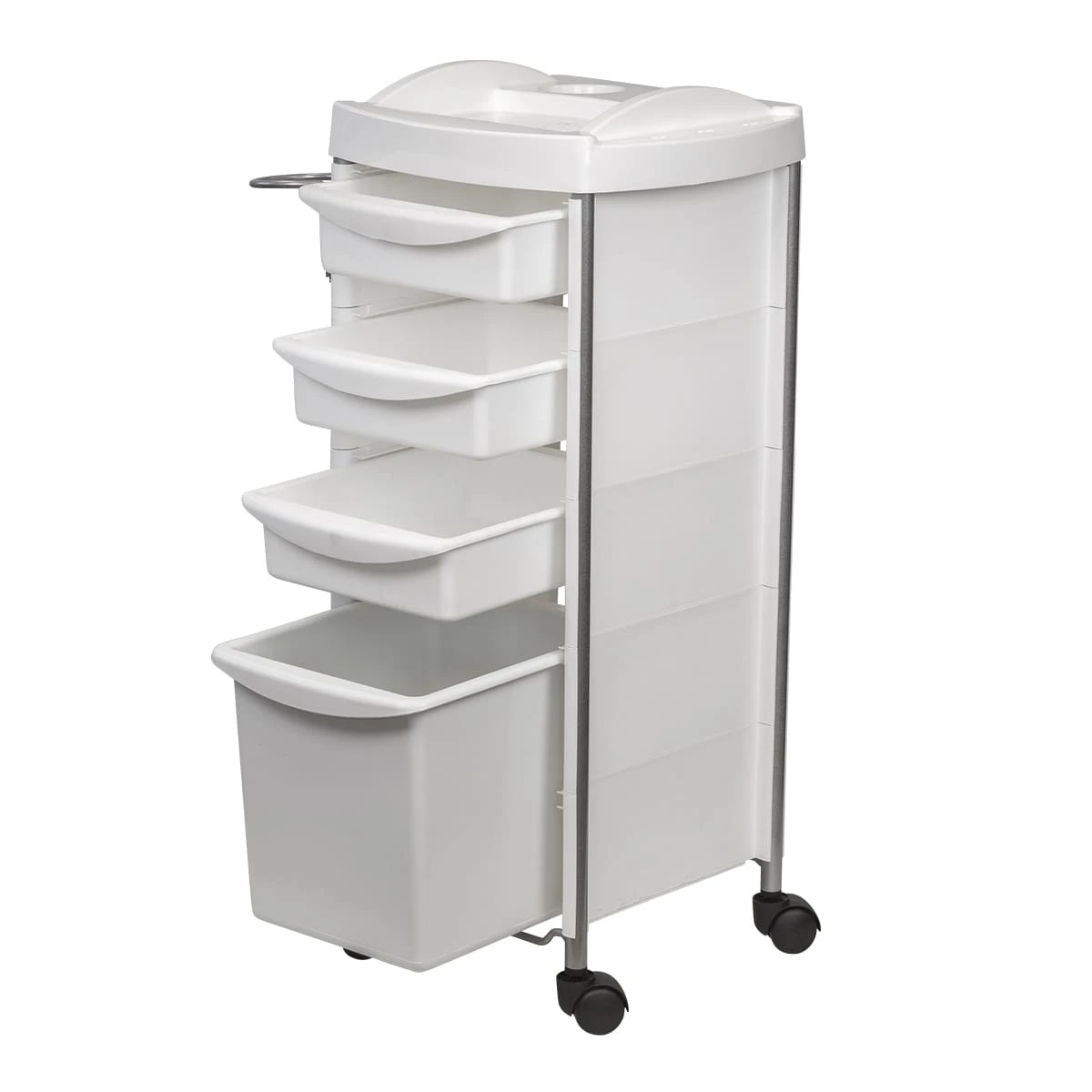 Каркас парикмахерского оборудования выполнен из металлических труб. Ящики, полка и боковины изготовлены из прочного пластика. Материал не деформируется при случайном попадании косметических средств, хорошо переносит регулярную чистку и дезинфекцию. Колеса из качественного пластика не оставляют царапин на полу и обеспечивают бесшумное перемещение оборудования.