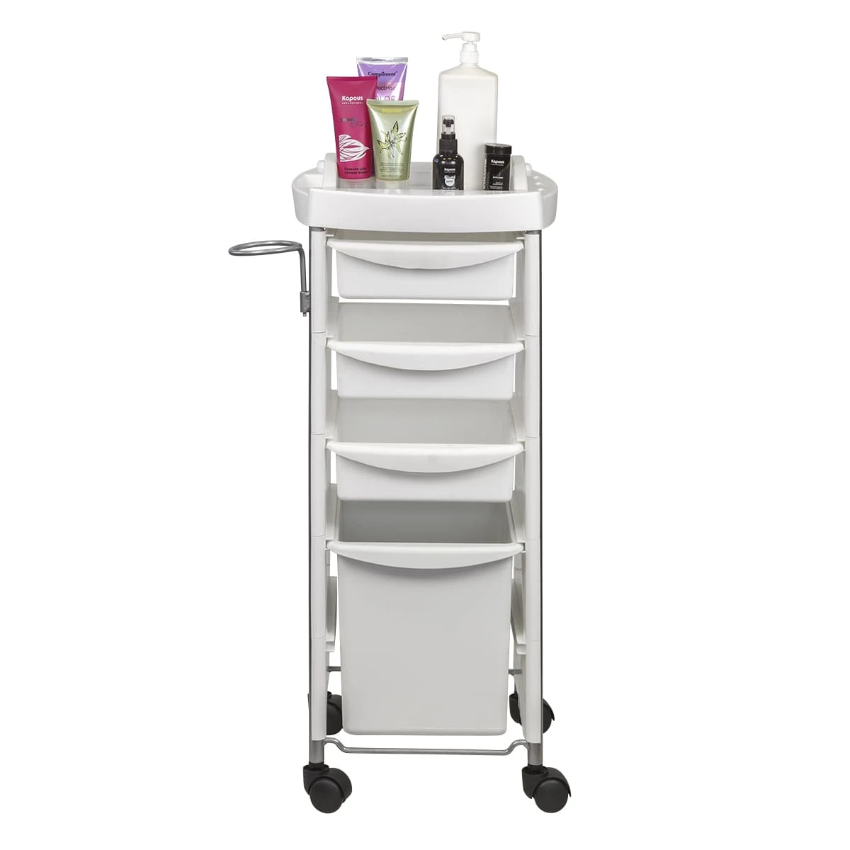 Хорошо продуманная конструкция без лишних деталей позволит мастеру хранить рабочие приспособления в одном месте. На верхней полке высокие бортики и углубления, что предотвратит выпадение косметических средств. На боковой стороне есть держатель для фена.Нижний большой ящик может быть использован в качестве бака для отходов после процедур.