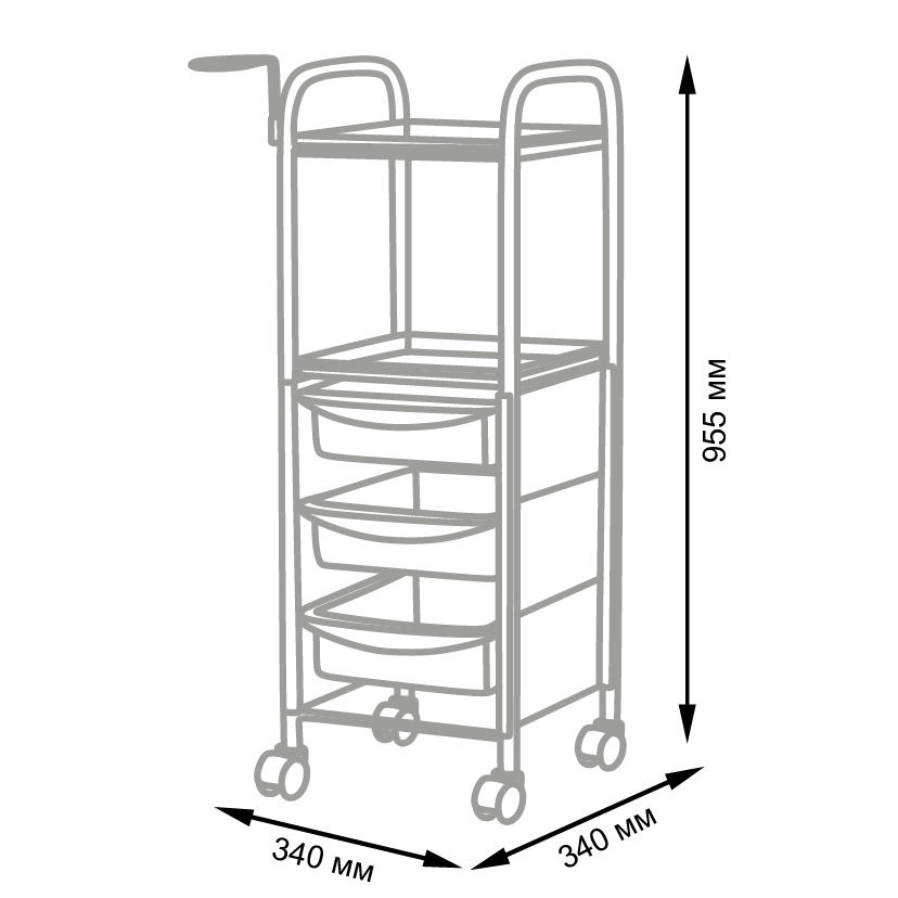 Каркас, полочки и фенодержатель изготовлены из прочного металла. Для защиты от коррозии и влаги на поверхность нанесен слой краски. Для создания боковин и ящиков использован качественный пластик устойчивый к влиянию очищающих средств. Пластиковые колеса предотвратят скольжение конструкции.