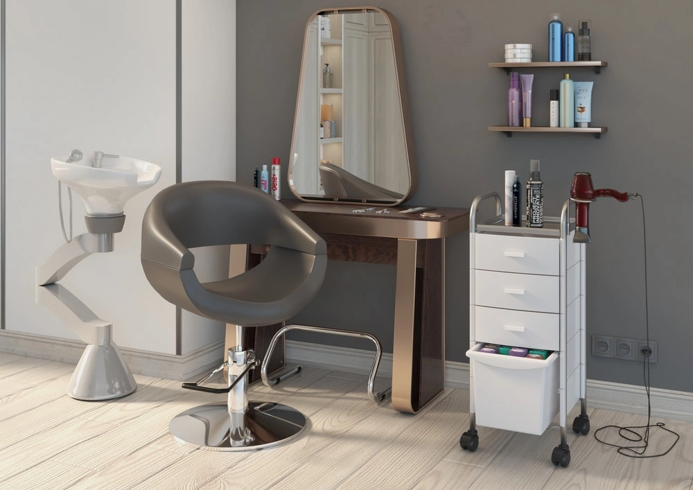 Парикмахерское зеркало не искажает изображение, что позволит мастеру качественно выполнять свою работу. Практичное дополнение зеркала – функциональный стол, на котором можно разложить инструменты и расходные материалы. Для фена предусмотрен держатель в столешнице. Под столешницей есть розетка. Парикмахерское оборудование устанавливается на пол и не требует дополнительного крепления.