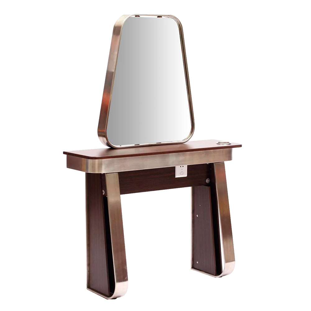 Гладкое зеркальное полотно установлено на качественной основе из многослойной фанеры. Рама выполнена из прочной хромированной стали. Для изготовления стола использована ламинированная ЛДСП. По краю столешницы и ножек есть окантовка из прочного металла. Материалы, использованные для изготовления парикмахерского оборудования, устойчивы к воздействию влаги, косметических препаратов и моющим средствам.