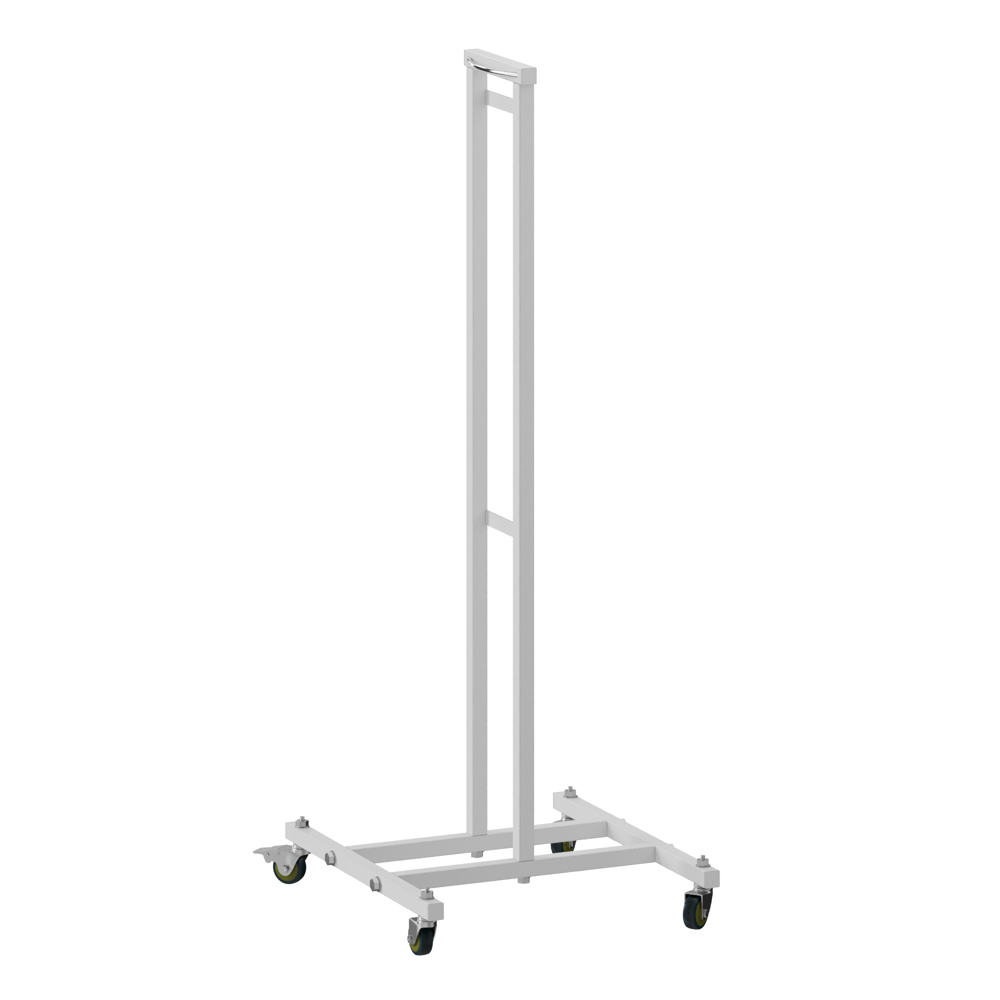 Передвижная подставка содержит четыре резиновых колёсика для перемещения по поверхности пола. Для фиксации подставки передвижной колёса снабжены специальным тормозным устройством. Подставка выполнена из профильной стальной трубы 20х20 мм и покрыта химически стойким порошковым покрытием. При необходимости подставка может легко разбираться и размещаться в небольшом объёме.