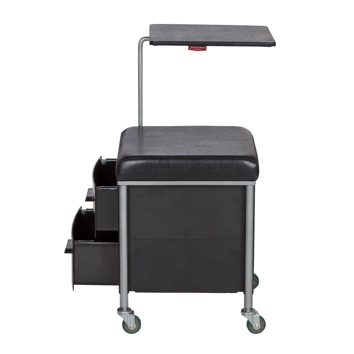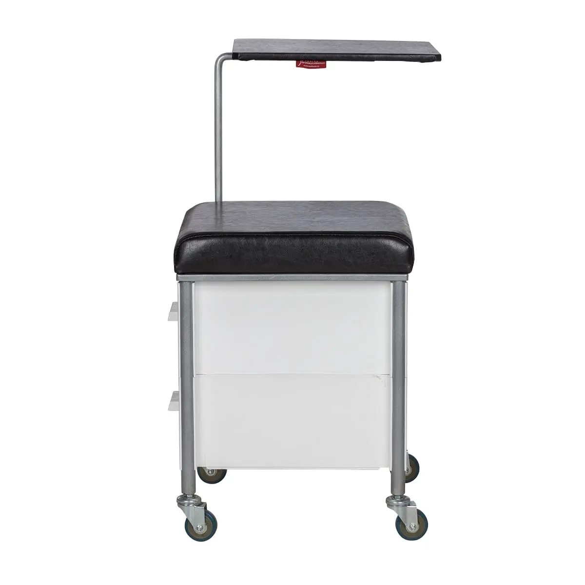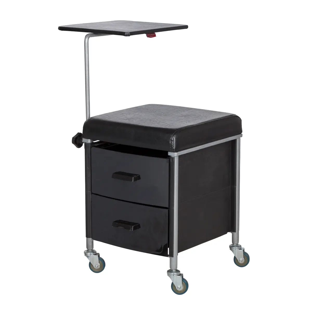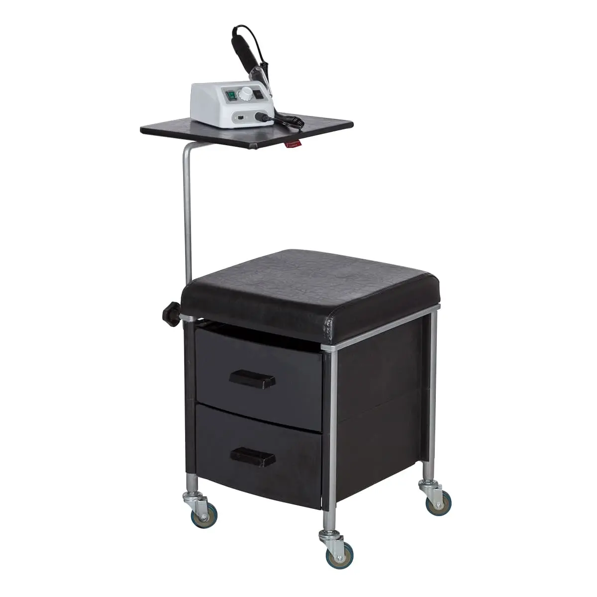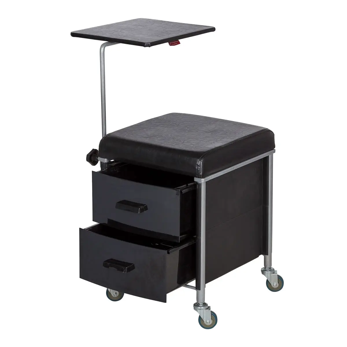 На удобном пуфике мастер может с комфортом провести процедуры. Под сидением предусмотрены два вместительных ящика под необходимые инструменты мастера. Столешницу можно регулировать по высоте, чтобы подобрать оптимальную высоту для работы. Чтобы сэкономить время специалистов, стул для мастера педикюра оснащен поворотными колесами, которые позволят легко перемещаться, не вставая с места.