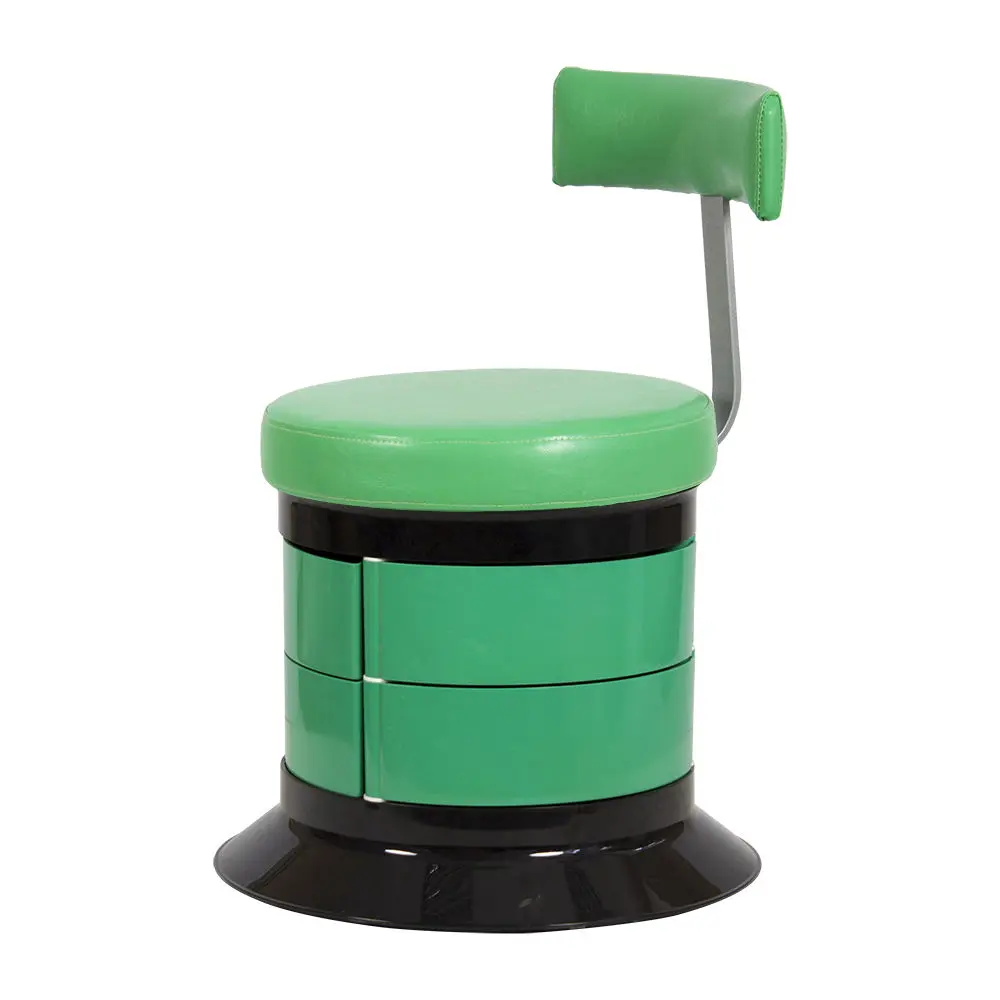За комфорт пуфика отвечает мягкое сидение. Эргономичная спинка – дополнительное удобство для осанки мастера. В оборудовании предусмотрен практичный элемент – шесть вместительных ящичков. Специалисту не придется тратить время на поиски инструмента по салону. Бесшумно и быстро перемещаться во время рабочего процесса позволяют шесть маневренных колес.